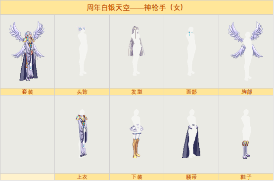 套装效果上来看,与男枪手相比,女枪手整体风格会更偏向优雅华丽。银白主调搭配羽翼与华丽袍装,裙装、飘带等细节共同衬托出女神枪手的优雅飒爽,整套造型精致灵动,完美契合职业干练气质。