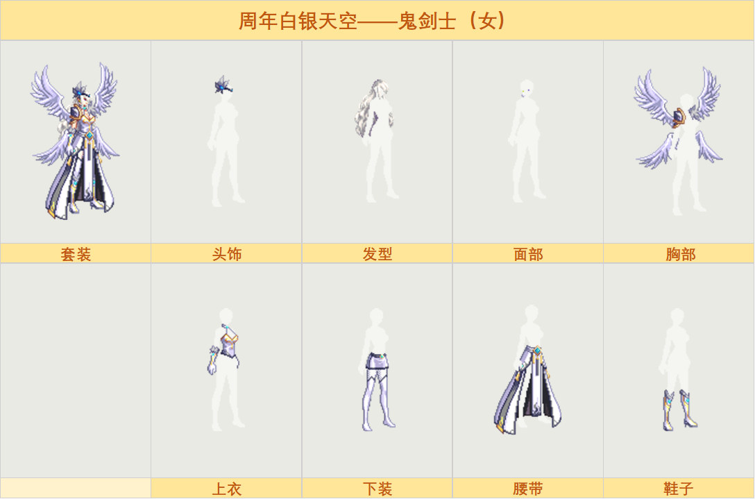 套装整体看,银白主色调下,搭配羽翼元素与华丽裙装,整体风格既保有神圣感,又契合女鬼剑优雅飒爽的职业气质,造型华丽且细节精致。
