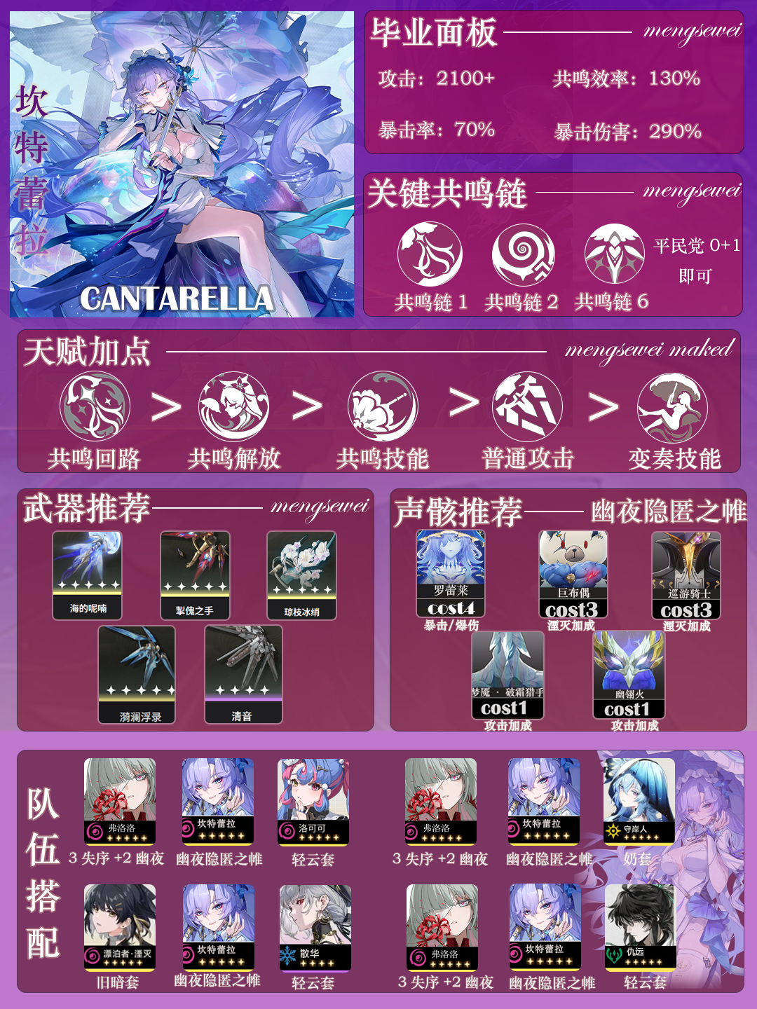 弗洛洛的抽取 优先级,专武>坎>2链。算了算专武提升在20'%区间。有人问我,新手到底01弗洛洛,还是坎00弗00号。对于这个问题想了很多,一方面萌新两队都凑不齐,我还是建议先抽坎吧。另一方面毕竟散花很忙,暗主散华维利奈刚好一队,弗坎卜灵一队。就跟甜咸粽子之争,你说专武不歪,他说坎能凑2队,保证生存等等…大家都✓。有条件的自然是01弗+坎最好,不会出现这种问题。坎对弗的提升是独一档的 弗大招开完以后需要一个能长轴站场➕打声骸伤害的队友 坎完全符合的同时还能提供生存 平替是仇远 仇远多一个加伤区间但站场时间太短 不过弗本体过于超模所以就算没有坎伤害也很不俗。2链超模,坎算的上锦上添花。