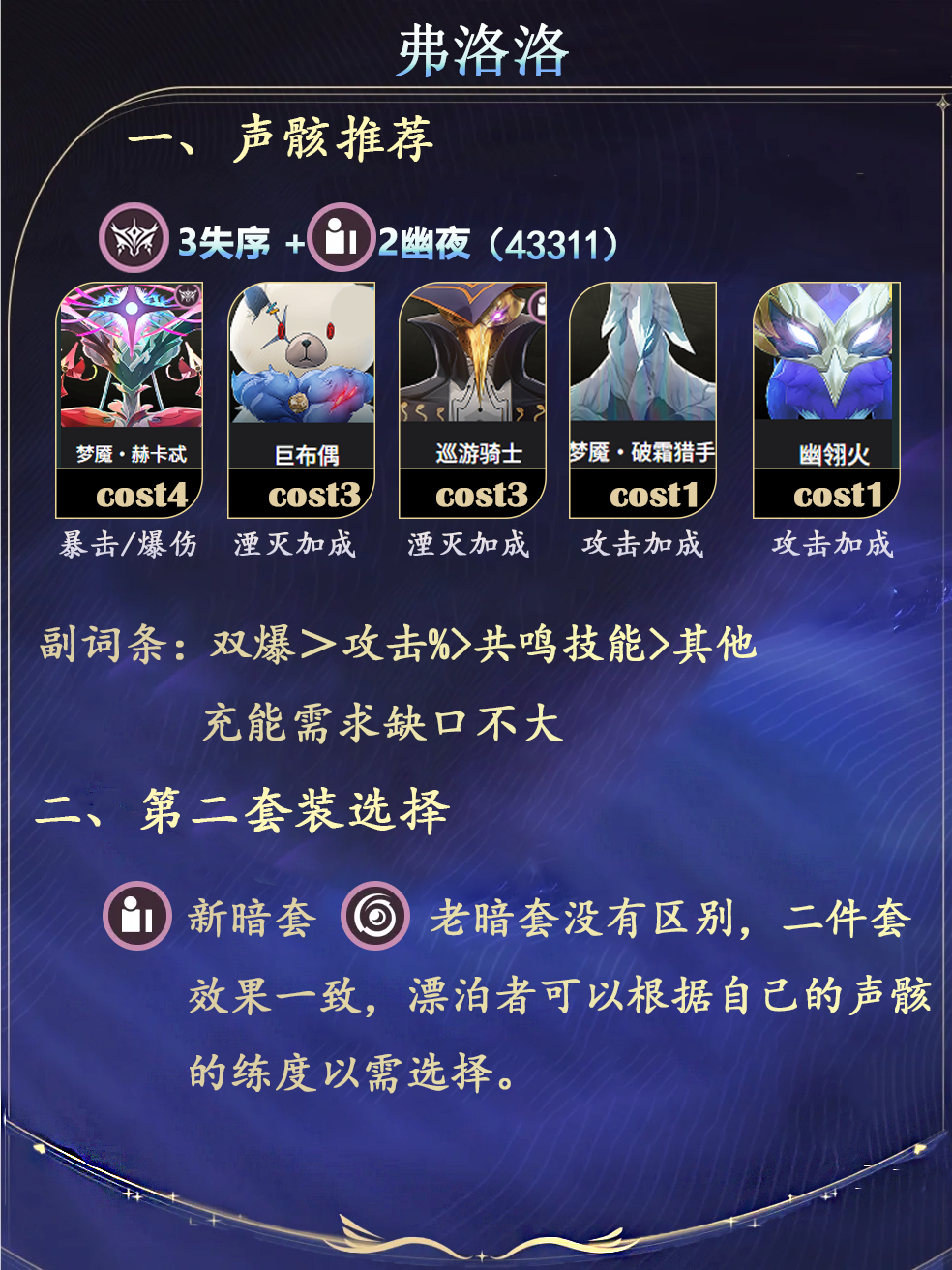 弗洛洛的抽取优先级,专武>坎>2链。算了算专武提升在20'%区间。有人问我,新手到底01弗洛洛,还是坎00弗00号。对于这个问题想了很多,一方面萌新两队都凑不齐,我还是建议先抽坎吧。另一方面毕竟散花很忙,暗主散华维利奈刚好一队,弗坎卜灵一队。就跟甜咸粽子之争,你说专武不歪,他说坎能凑2队,保证生存等等…大家都✓。有条件的自然是01弗+坎最好,不会出现这种问题。坎对弗的提升是独一档的 弗大招开完以后需要一个能长轴站场➕打声骸伤害的队友 坎完全符合的同时还能提供生存 平替是仇远 仇远多一个加伤区间但站场时间太短 不过弗本体过于超模所以就算没有坎伤害也很不俗。2链超模,坎算的上锦上添花。