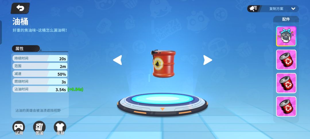评价:此搭配的想法是扩大油桶的攻击范围,变相的增加油桶的命中概率也就是变相的增加遮挡视野的概率