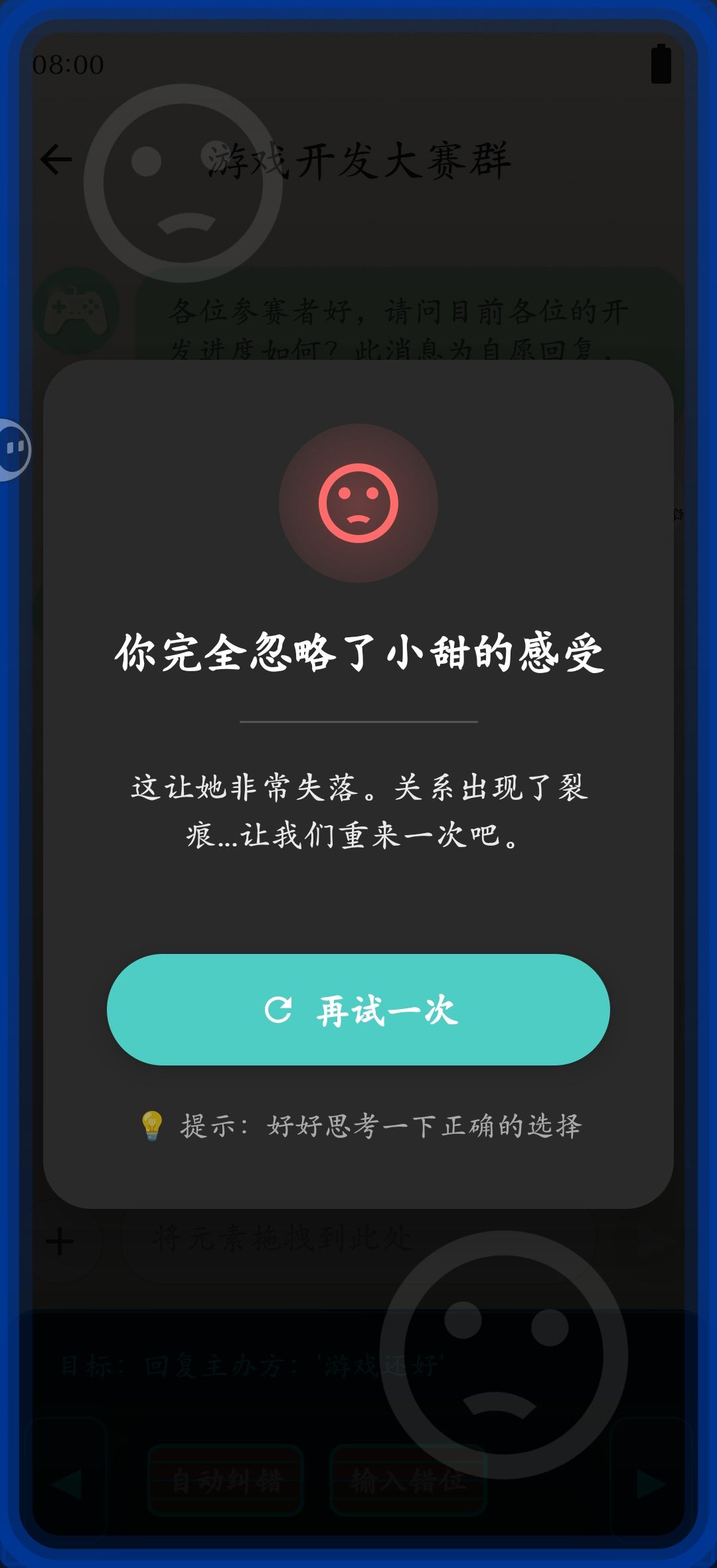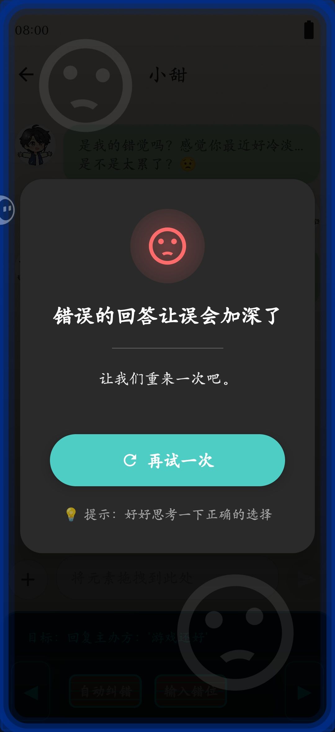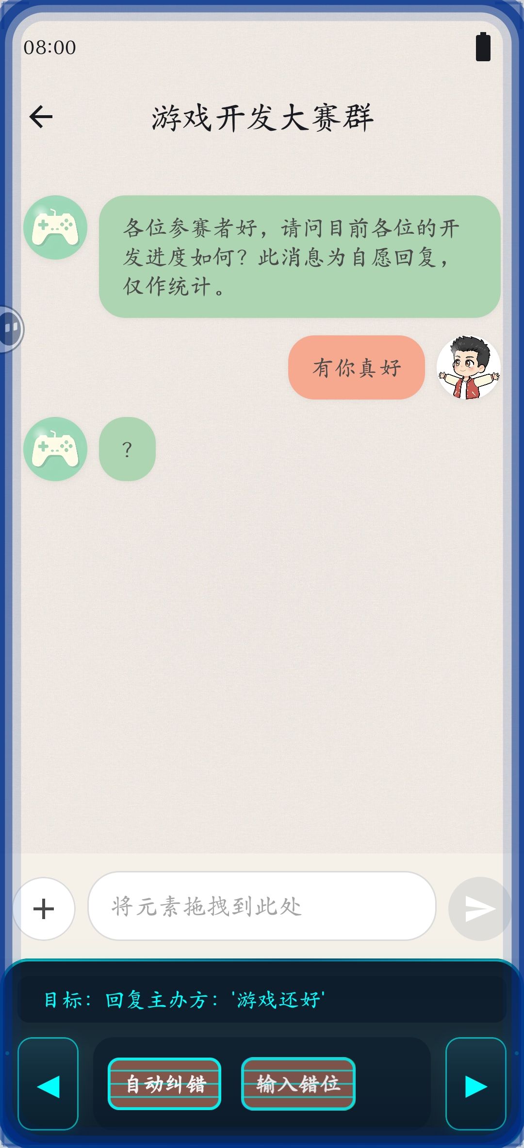p3拖动游戏标题图片-确认-返回聊天-小甜-拖动要发送的话至聊天框-自动纠错-发送-结局3get✓