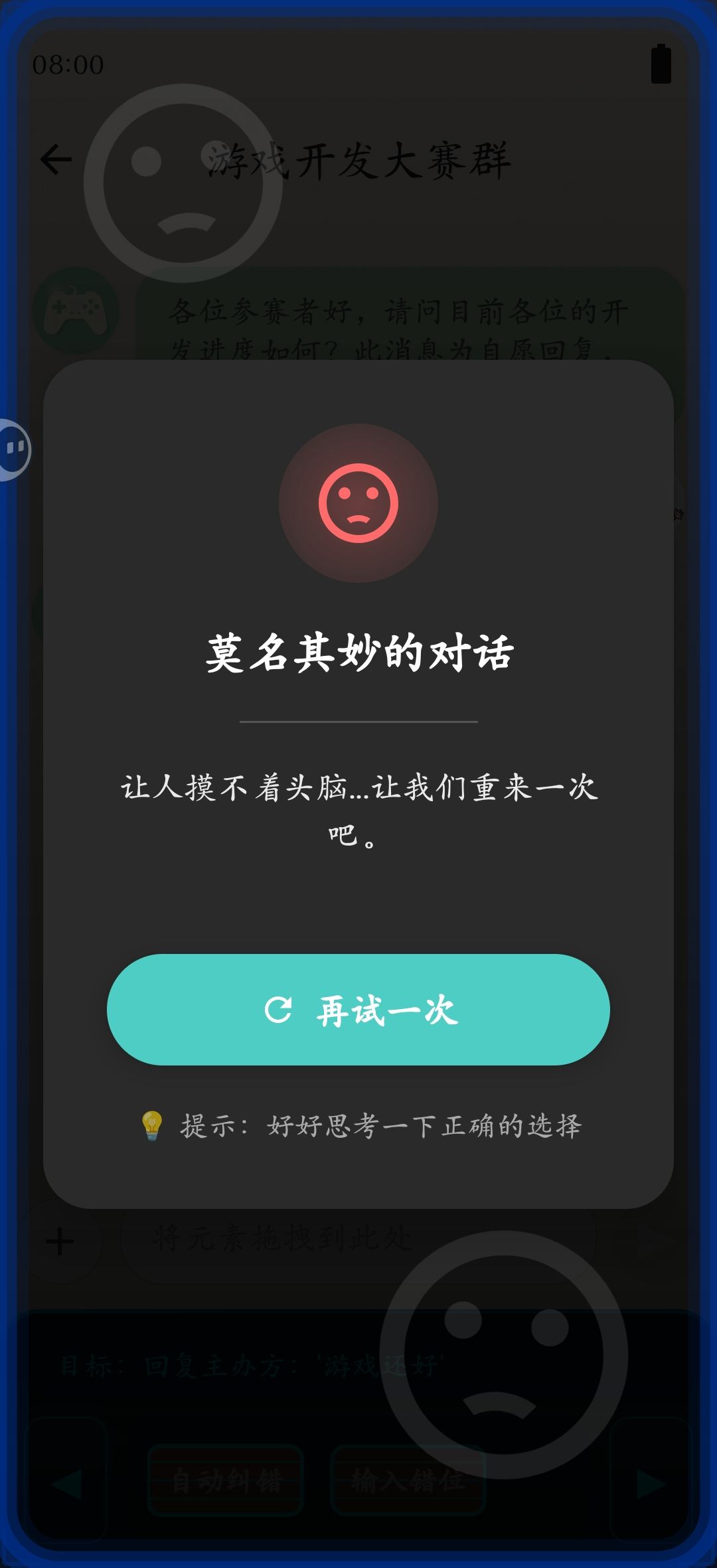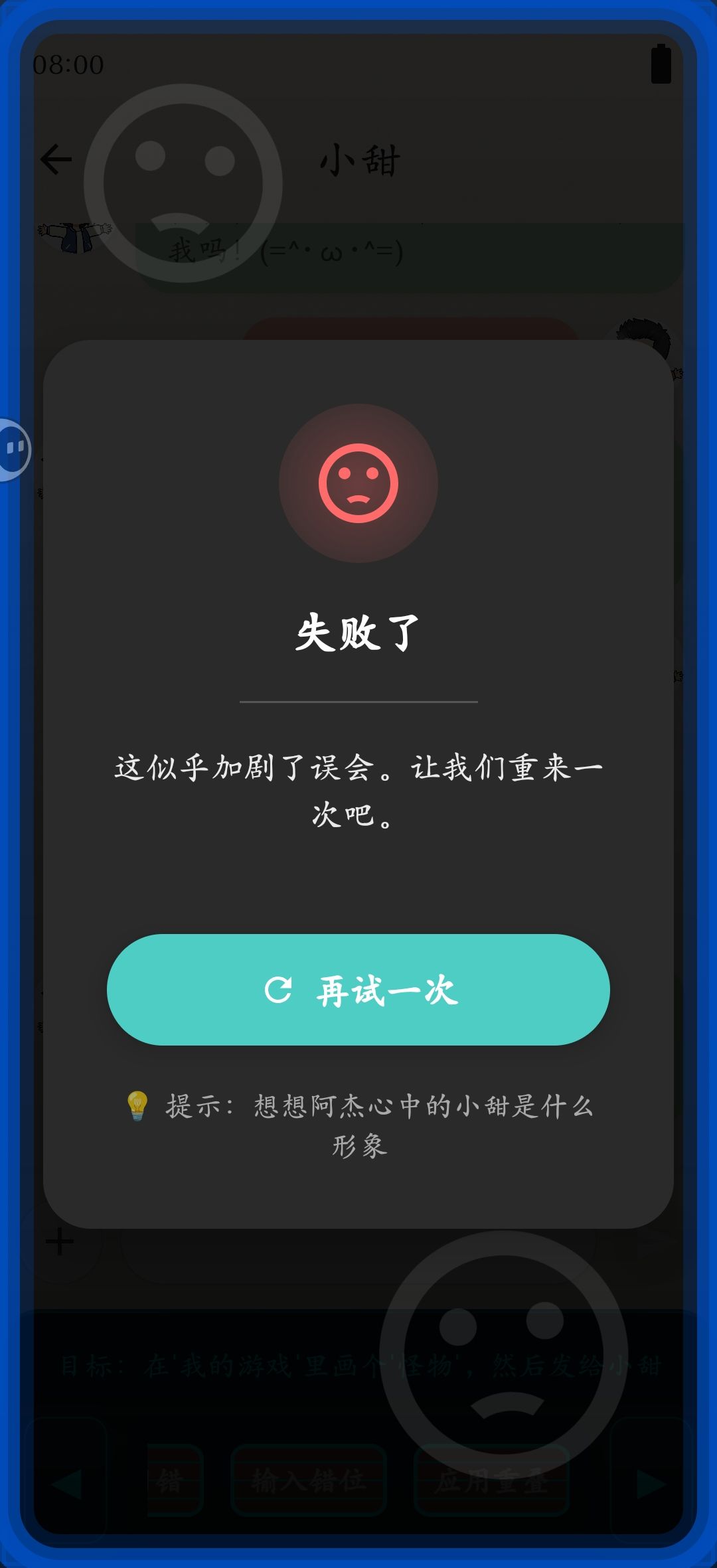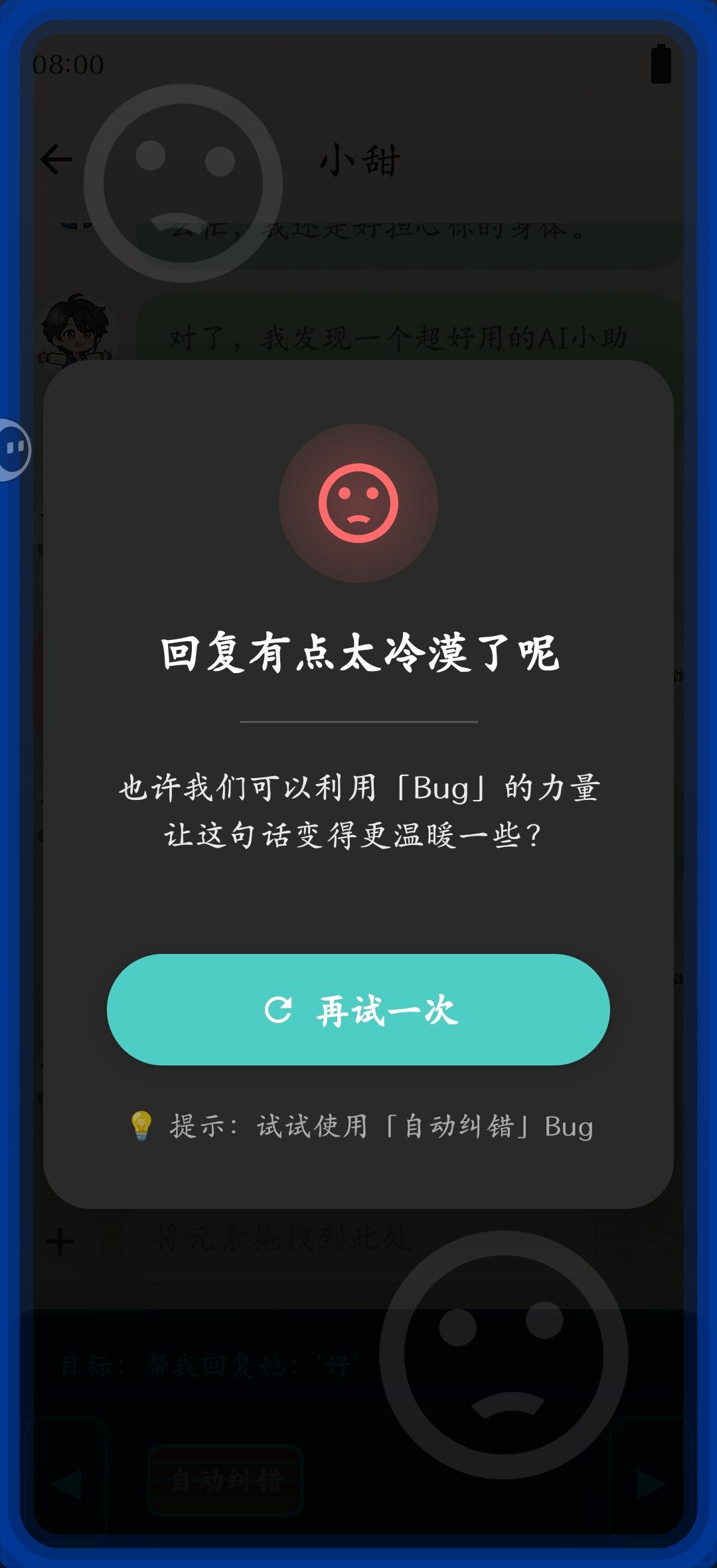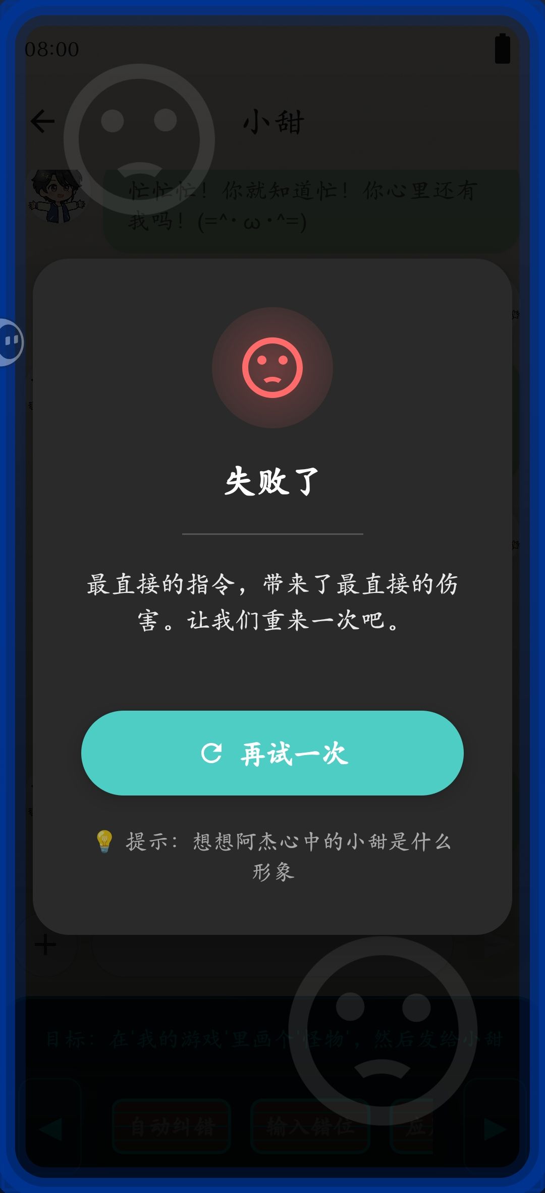 p2拖动游戏标题图片-应用重叠-小甜头像-应用重叠-阿杰头像-自动纠错-确认-返回聊天-小甜-拖动要发送的话至聊天框-发送-结局2get✓