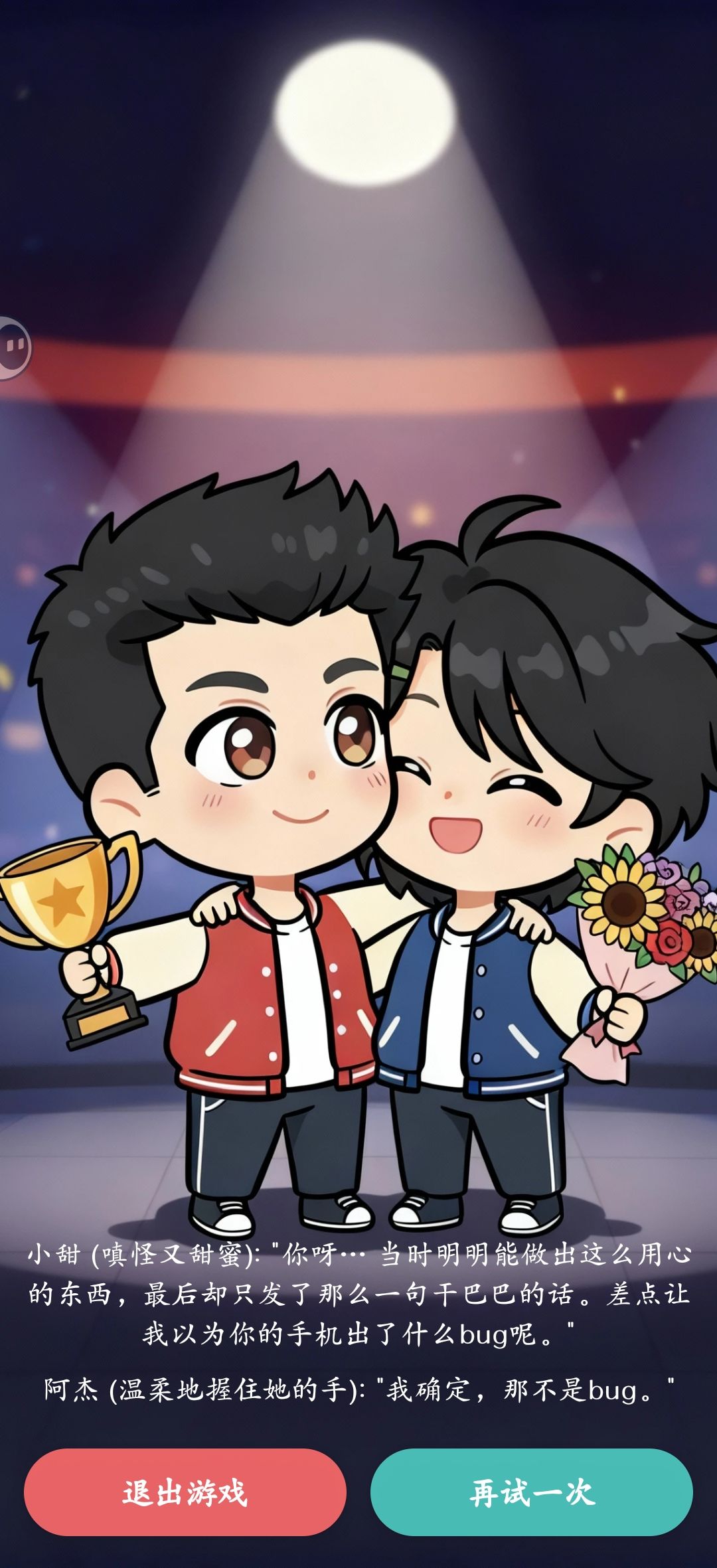 p1拖动游戏标题图片-确认-返回聊天-小甜-拖动要发送的话至聊天框-发送-结局1get✓