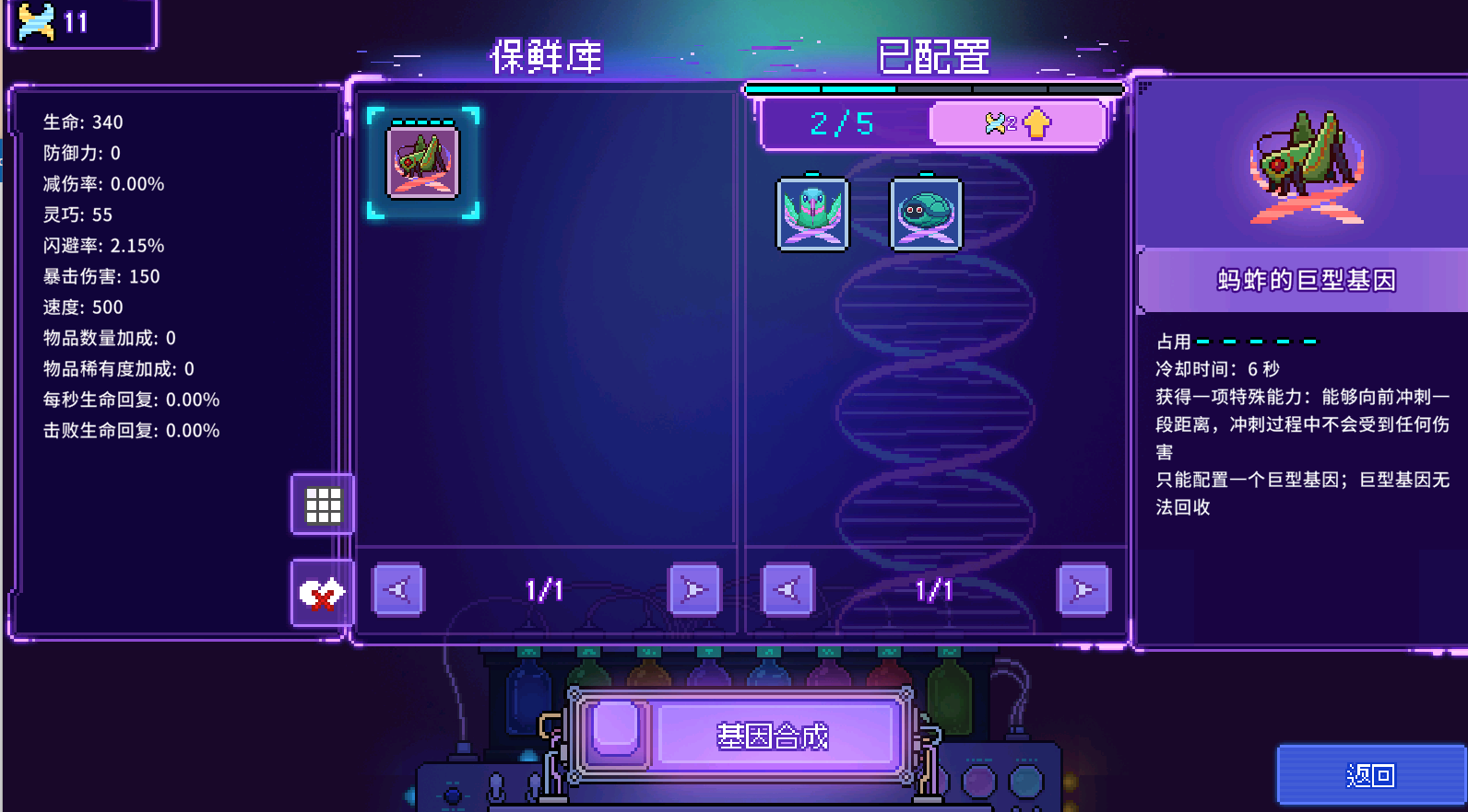 顺带一提,通过1-2后我们就解锁了保鲜库,并会获得一些基因,战斗前记得将基因装填上。