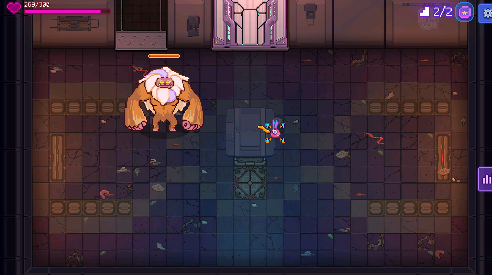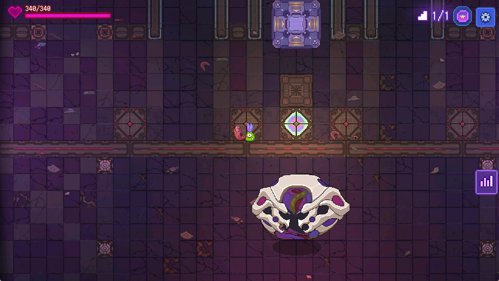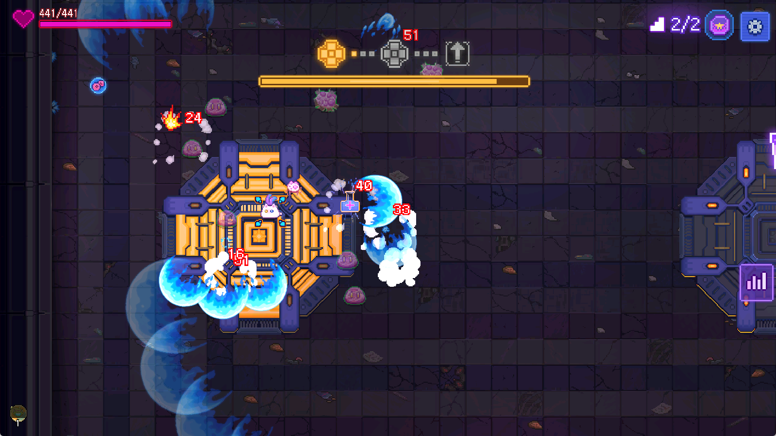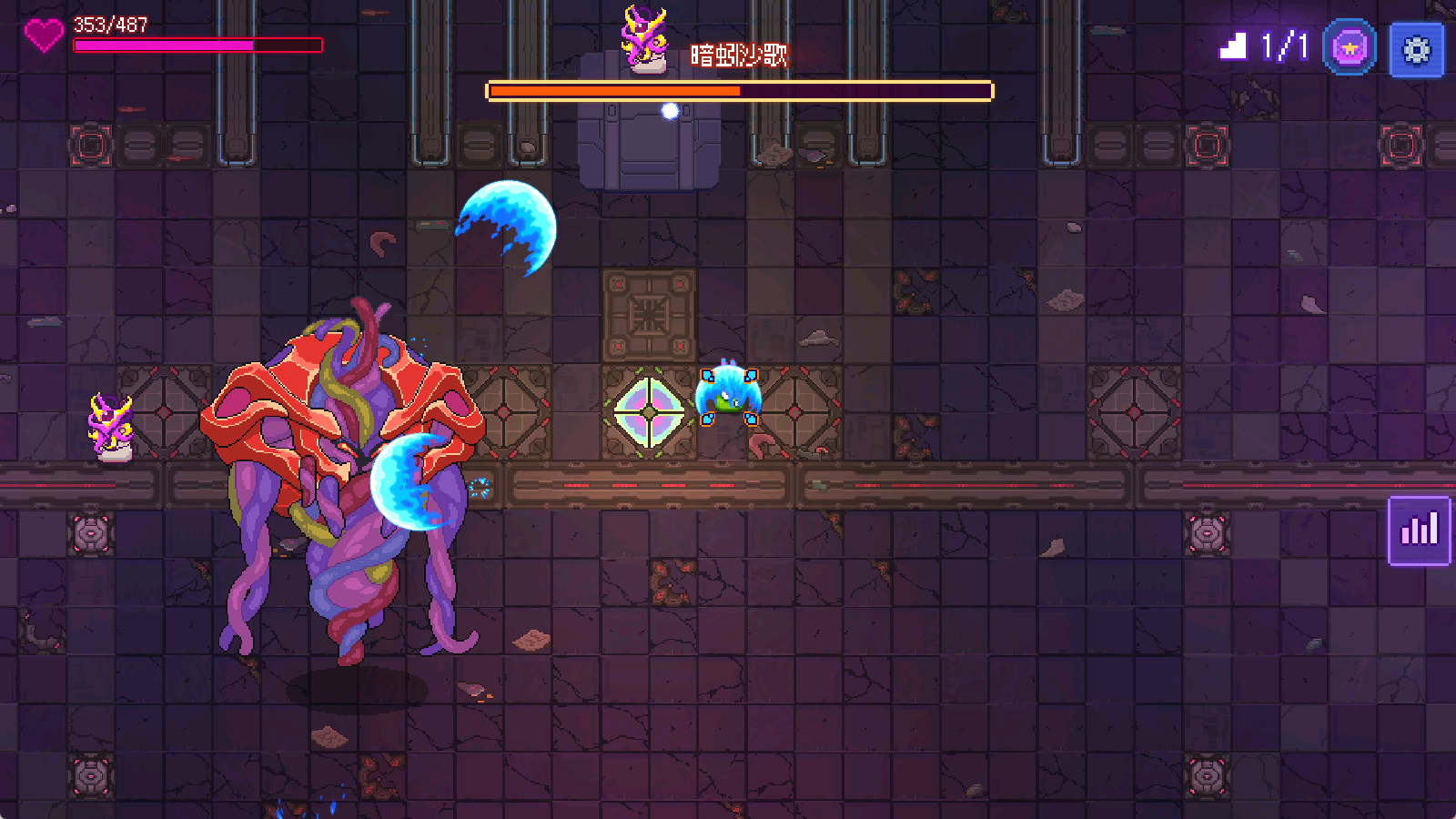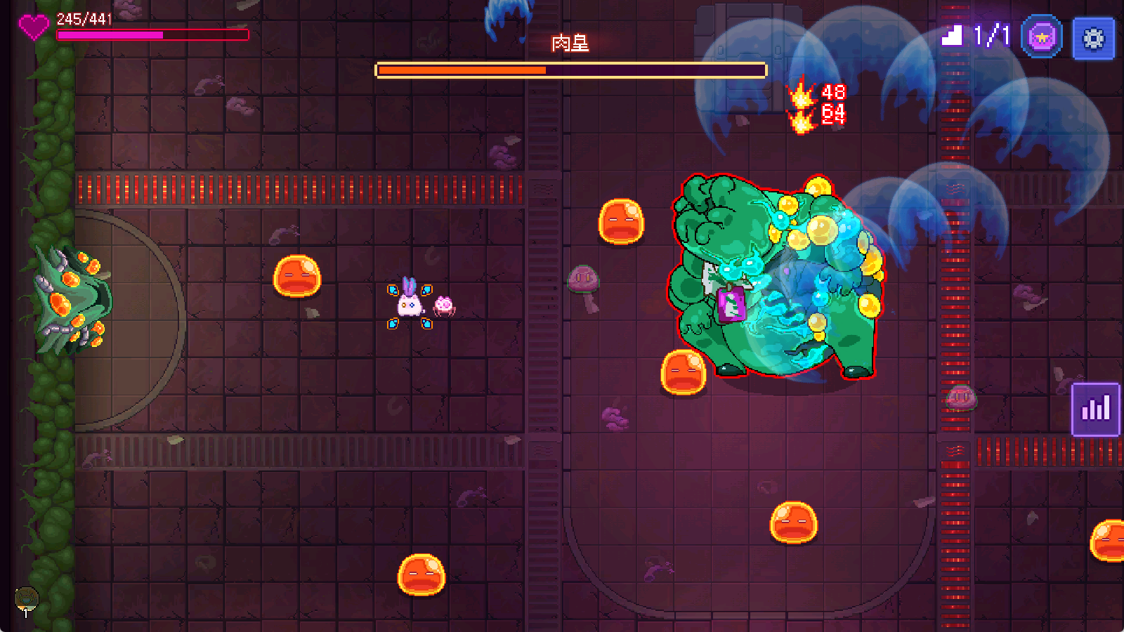 而1-4有概率刷出小Boss窝窝头,体型对比先前的Boss来说小一些,其攻击方式是发射3枚弹幕,对于此时的我们来说也已经不在话下。
