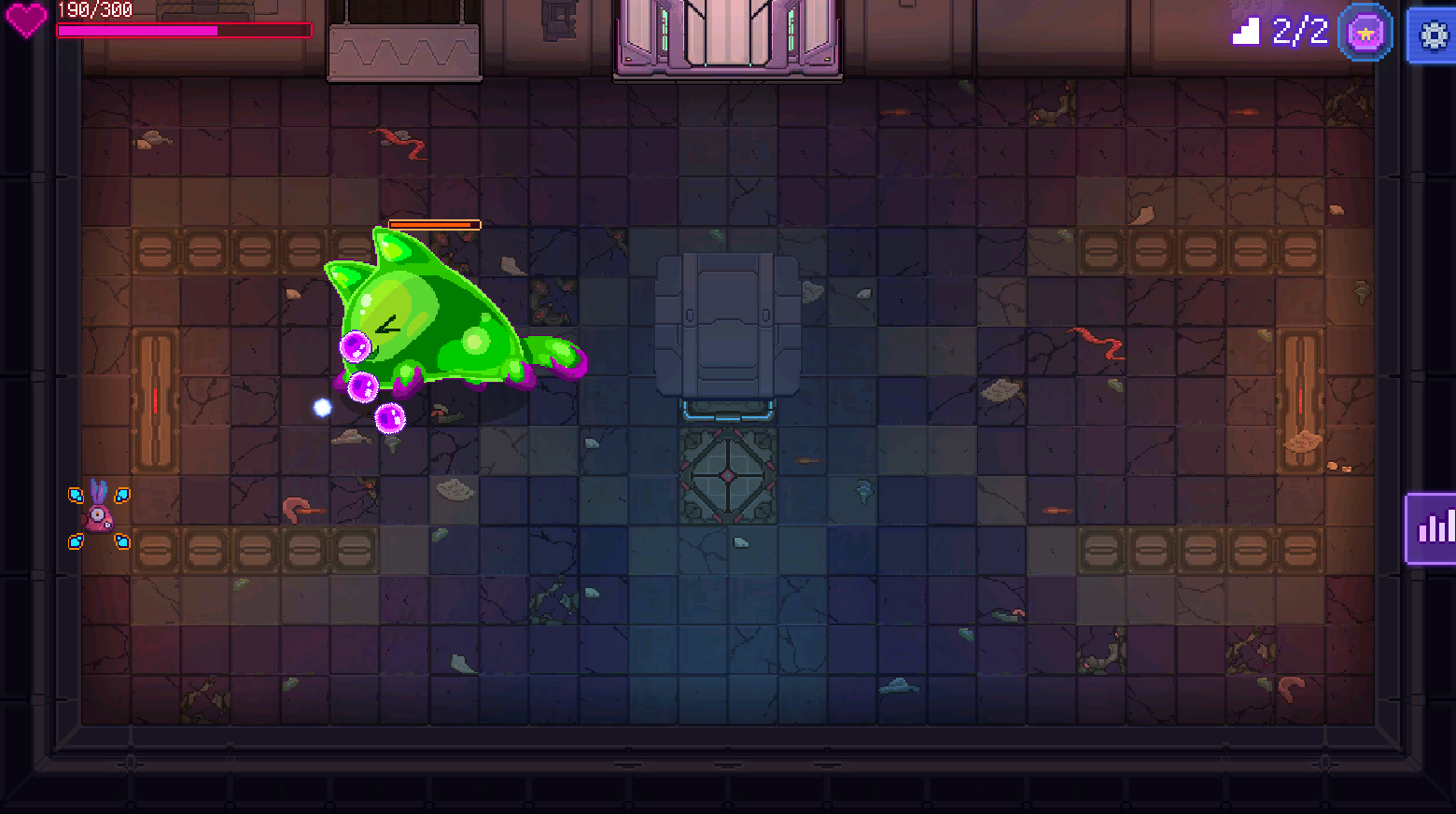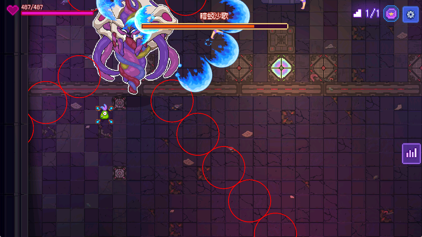 其攻击方式主要是发射三颗可弹射的大颗紫色子弹,所以要注意走位