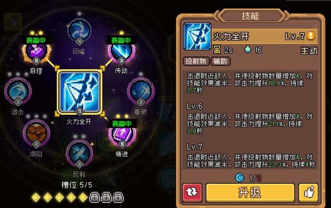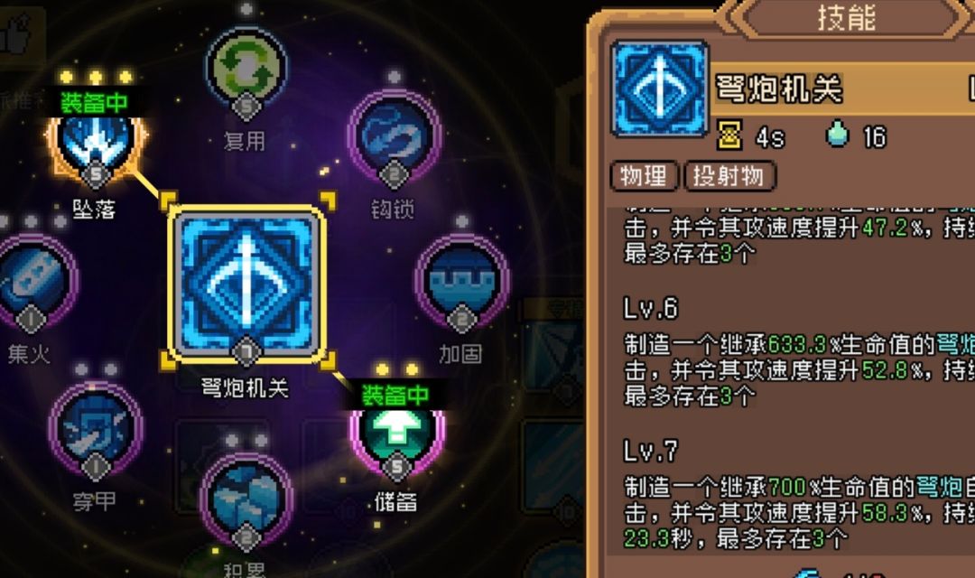 分裂一级不会有伤害总减,但是配合火力全开和专精可以达到一次技能放5个弩炮机关。