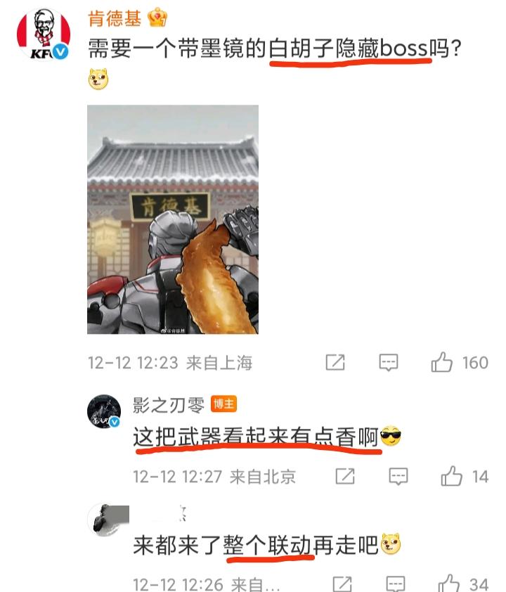 在评论区,肯德基毛遂自荐:“需要一个带墨镜的白胡子隐藏boss吗?”