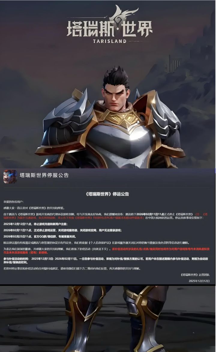 昨天腾讯突然发公告,说《塔瑞斯世界》国服要停运了。 官方给出的理由是跟开发商的代理协议到期,所以决定在2026年2月11号关服。