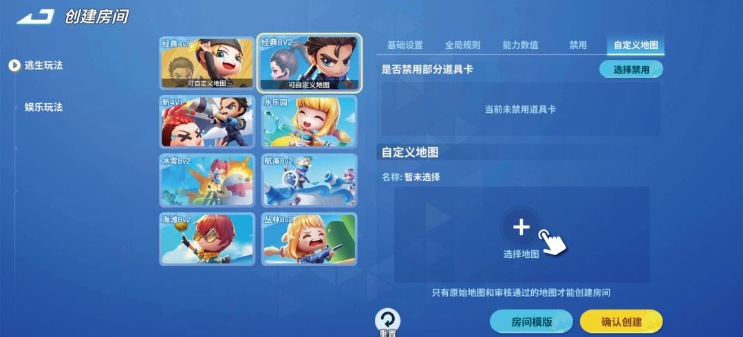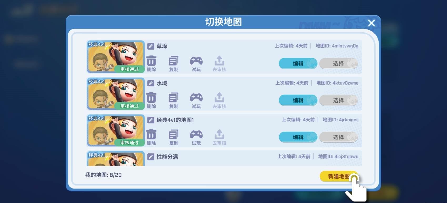 想要使用地图编辑器,你只需在创建房间页面点击上方的【选择地图】按钮,进入地图切换界面后,点击右下角的【新建地图】,即可开始设计与编辑属于你自己的独特地图!