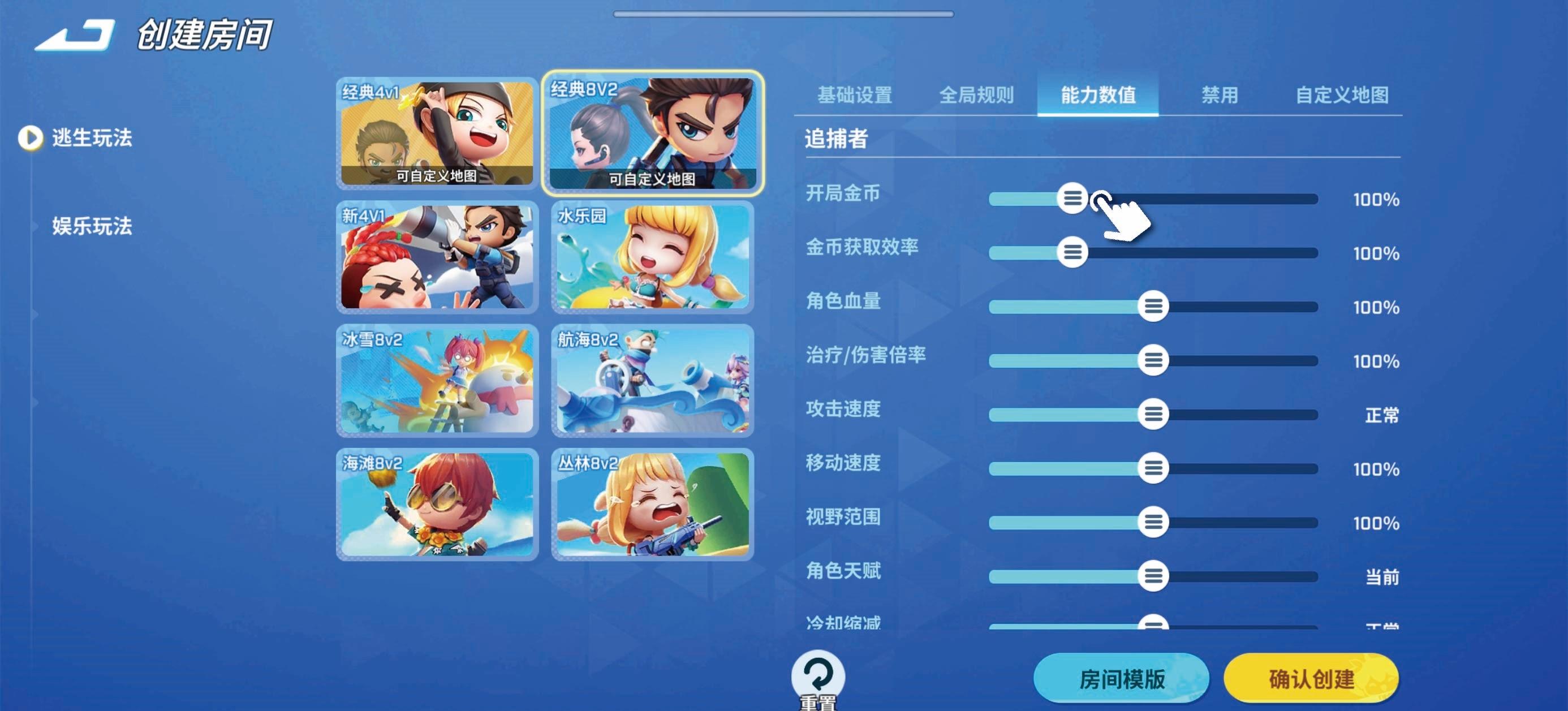 少年们可分别为追捕方与逃生方独立调整开局金币倍率,以此让一方开局即拥有充足资金,快速展开行动。金币倍率提供 0%、100%、500%、1000% 与 2000% 五档选择。