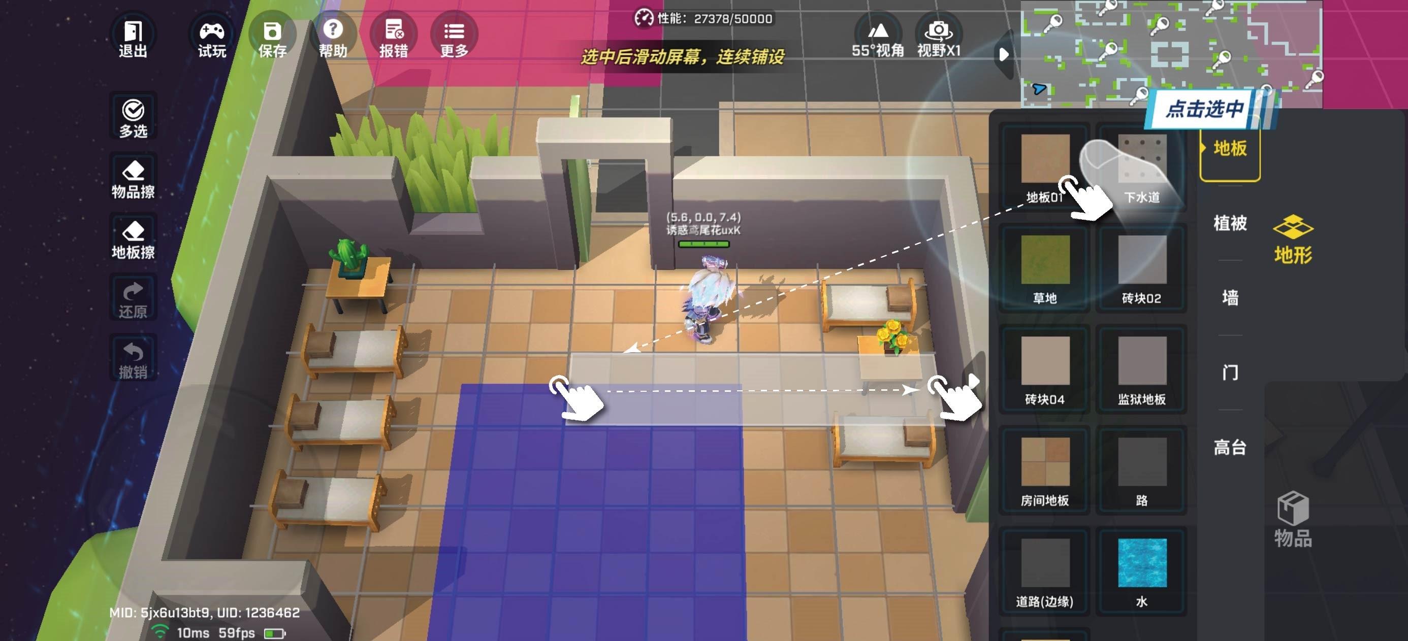 在“地形”创建菜单中,少年们可以自由放置多种颜色与类型的地板、墙面、植被、门和高台等物品。简单滑动即可快速铺设地形,操作轻松简单。