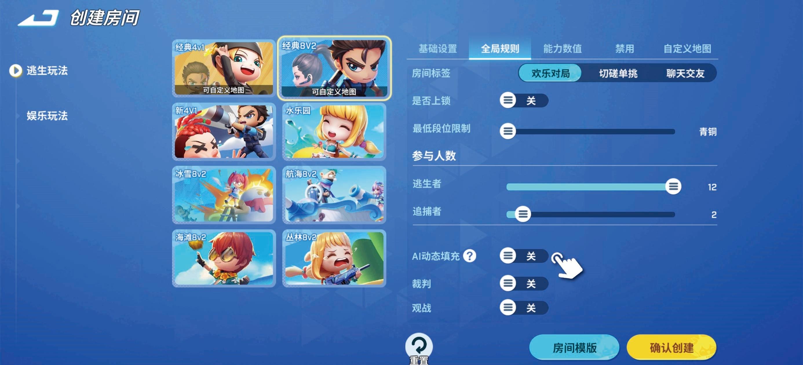 少年们在开局前可以选择是否通过ai补齐人数,支持ai难度设置,共有简单,中等,困难三个选项。