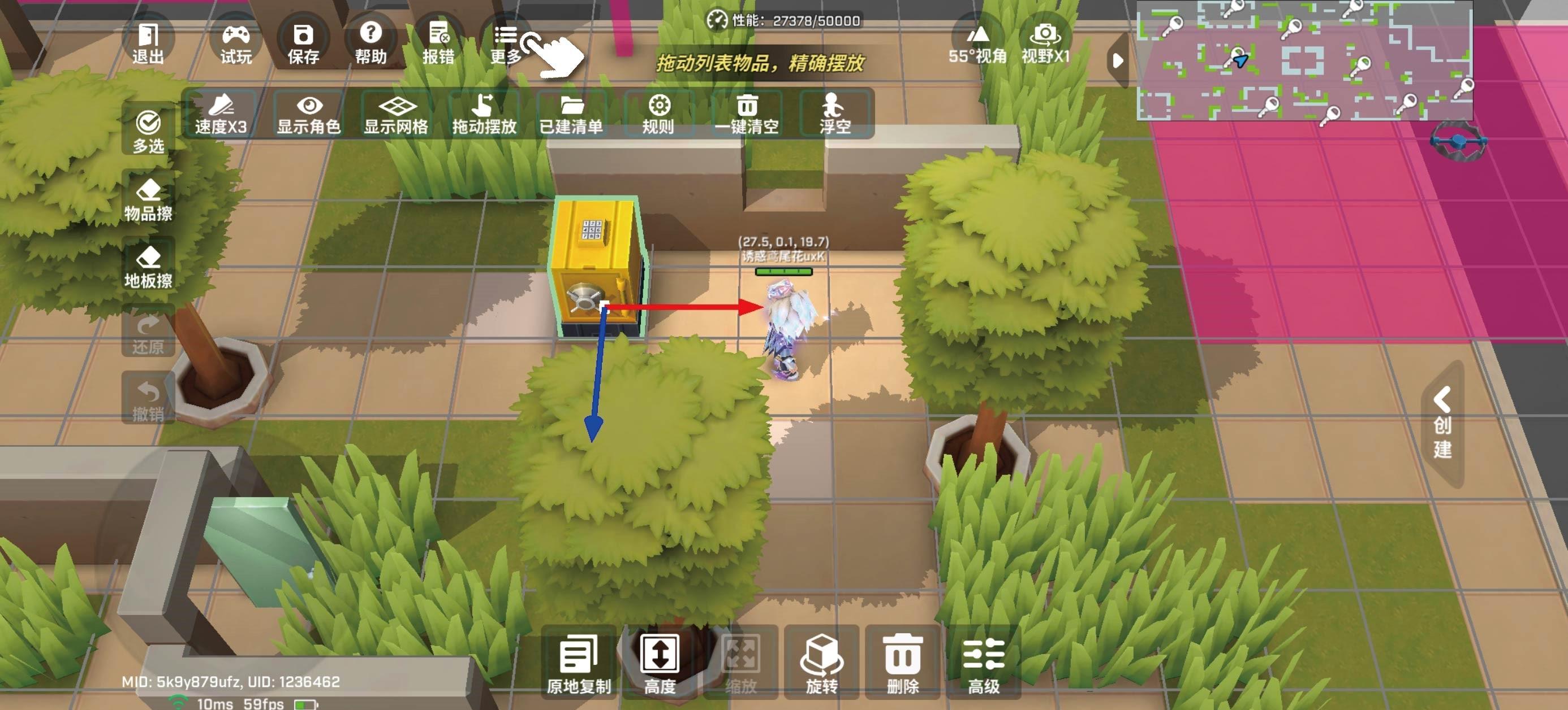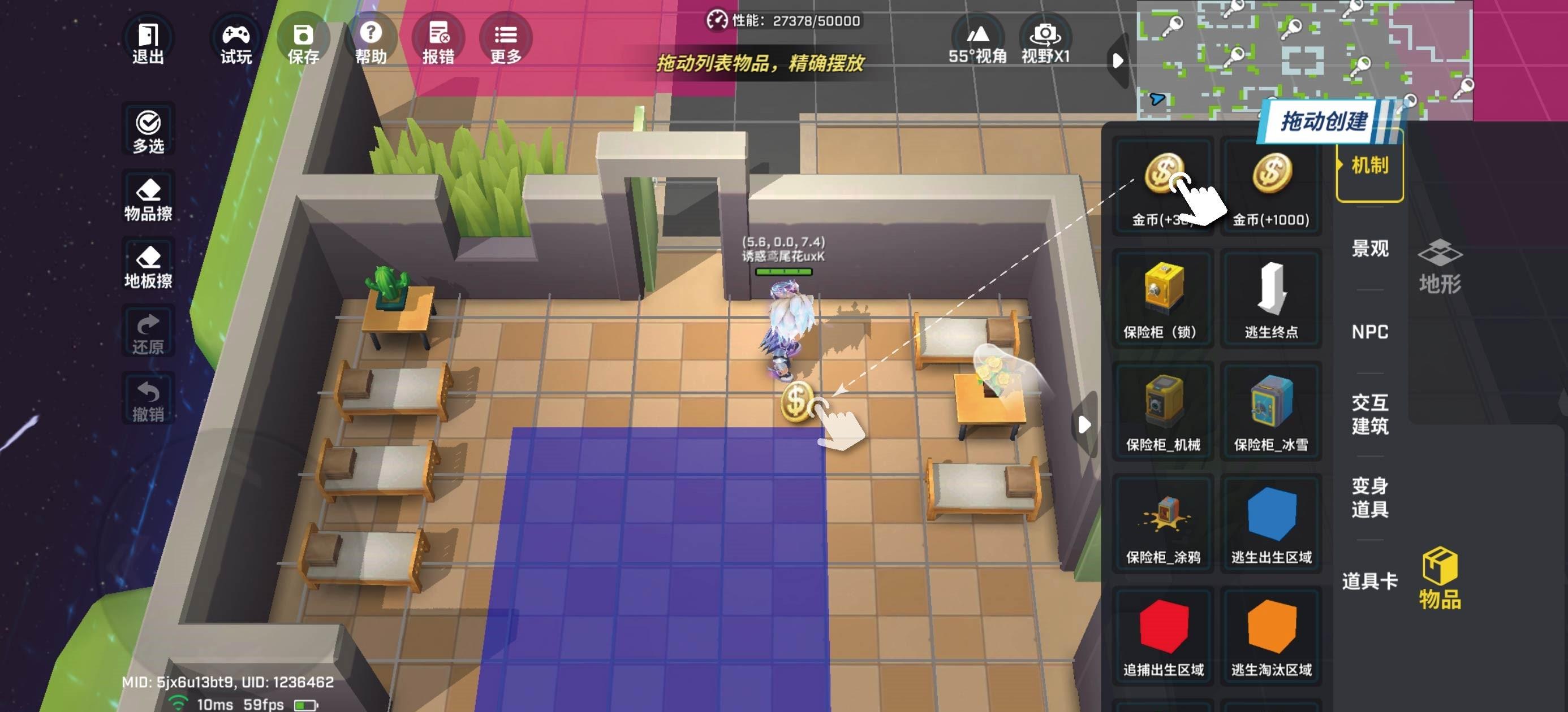 少年们可以通过拖拽或点击操作在地图中添加物品。除了可放置出生点、视野、金币与保险柜等游戏机制相关的物品外,还能放置景观、NPC、变身道具、道具卡等交互物品。