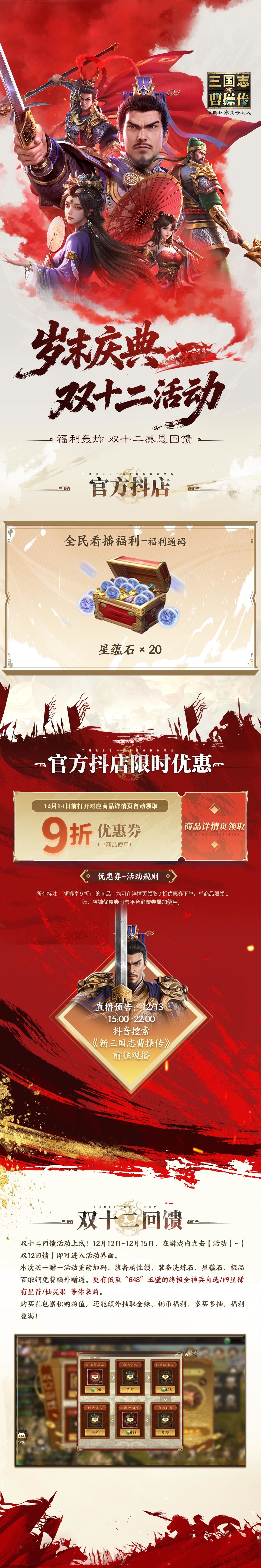 当三国烽烟遇上年终盛典,这波诚意绝对拉满!为答谢诸位英雄的鼎力支持,《新三国志曹操传》岁末庆典重磅开启 —— 抖店、微商城双渠道同步让利,折扣力度绝对让你满意 ,核心资源、珍稀道具统统打折,错过就得再等一整年!