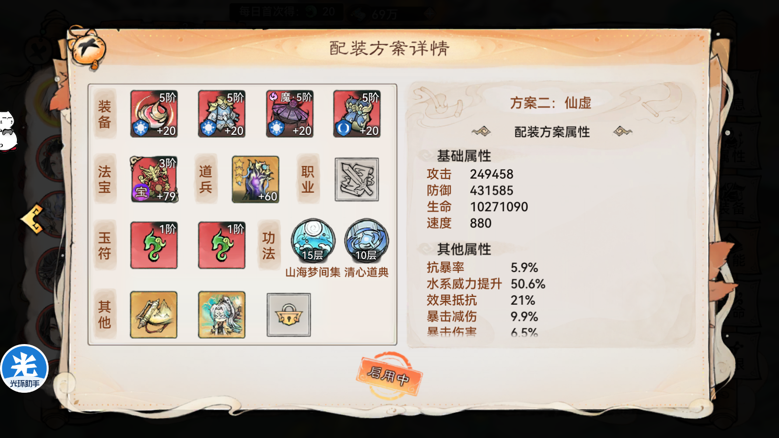 装备方面依旧选择【明光】套装进行增伤,灵符水阵,法宝选择【三阶火玉】,道兵选择带【日暮】,【日暮】有个特殊效果就是当受到群体伤害时,在伤害结算后会恢复12%生命。这个效果对于队伍带【刑天】的情况下会有奇效。