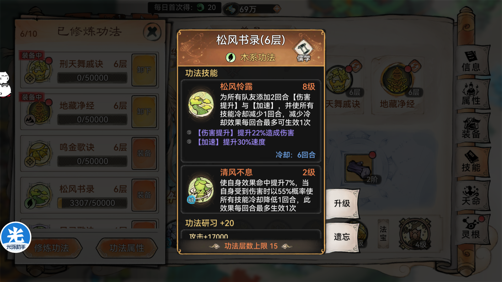 技能方面在必带【山海】的前提下,另一个技能的选择可以针对不同的关卡选择不同的技能,首先是【清心】,【清心】主要应用是在伤害足够并且需要驱散减益的关卡,目前最常用的就是应对毒蛾关,由于频繁的挂毒,此时【清心】就会发挥巨大的作用,在驱散减益的同时还能为所有队友挂一回合免疫。
