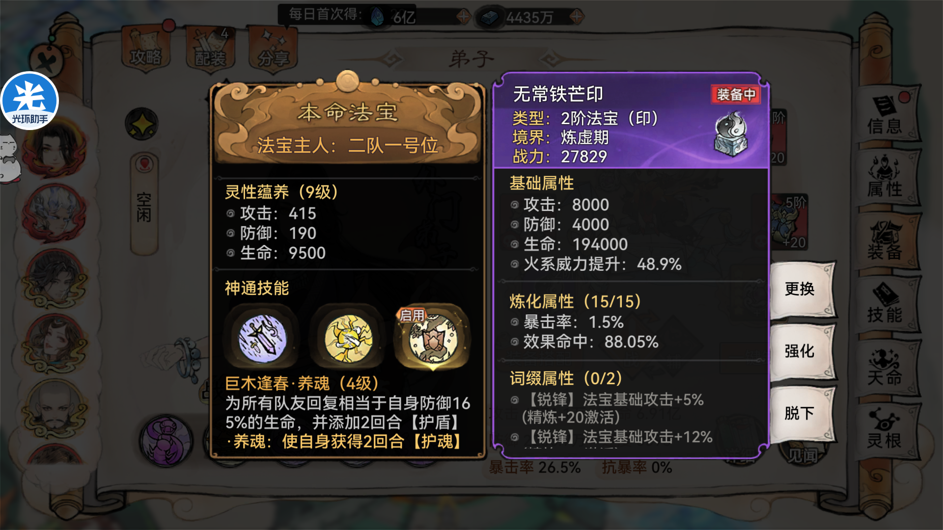 由于需要高命中来挂dot打伤害,所以我们在套装选择【败芒】的基础上,武器选择毛笔,玉符也是金阵,法宝方面建议做一个无常进行辅助增伤,属性选择火属性威力,技能选择二阶木,炼化命中,这样大概能够达到面板命中200左右算作及格。道兵可以根据技能进行更换,如果带【魂归山海】可以用笔刀,如果换其他技能可以带【灵蟾珠】。