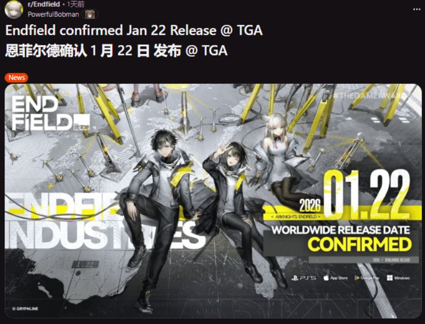 12月12日,TGA 2025年度游戏颁奖典礼上,鹰角网络正式宣布《明日方舟:终末地》全球公测定档2026年1月22日,不仅国内玩家表示迫不及待了,连外网Reddit玩家社区也引发狂欢热潮。