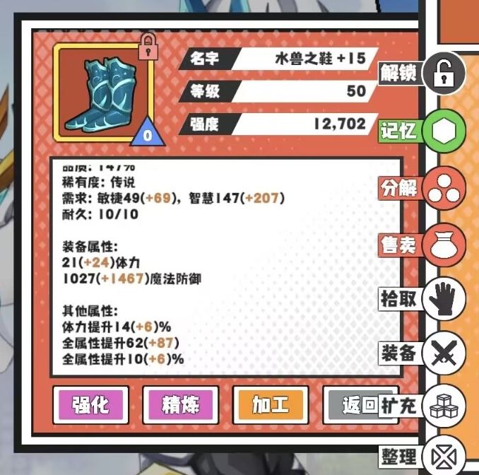 ②水兽鞋:有水龙兽的层掉落,唯一有全属性%的鞋,输出角色最强的鞋