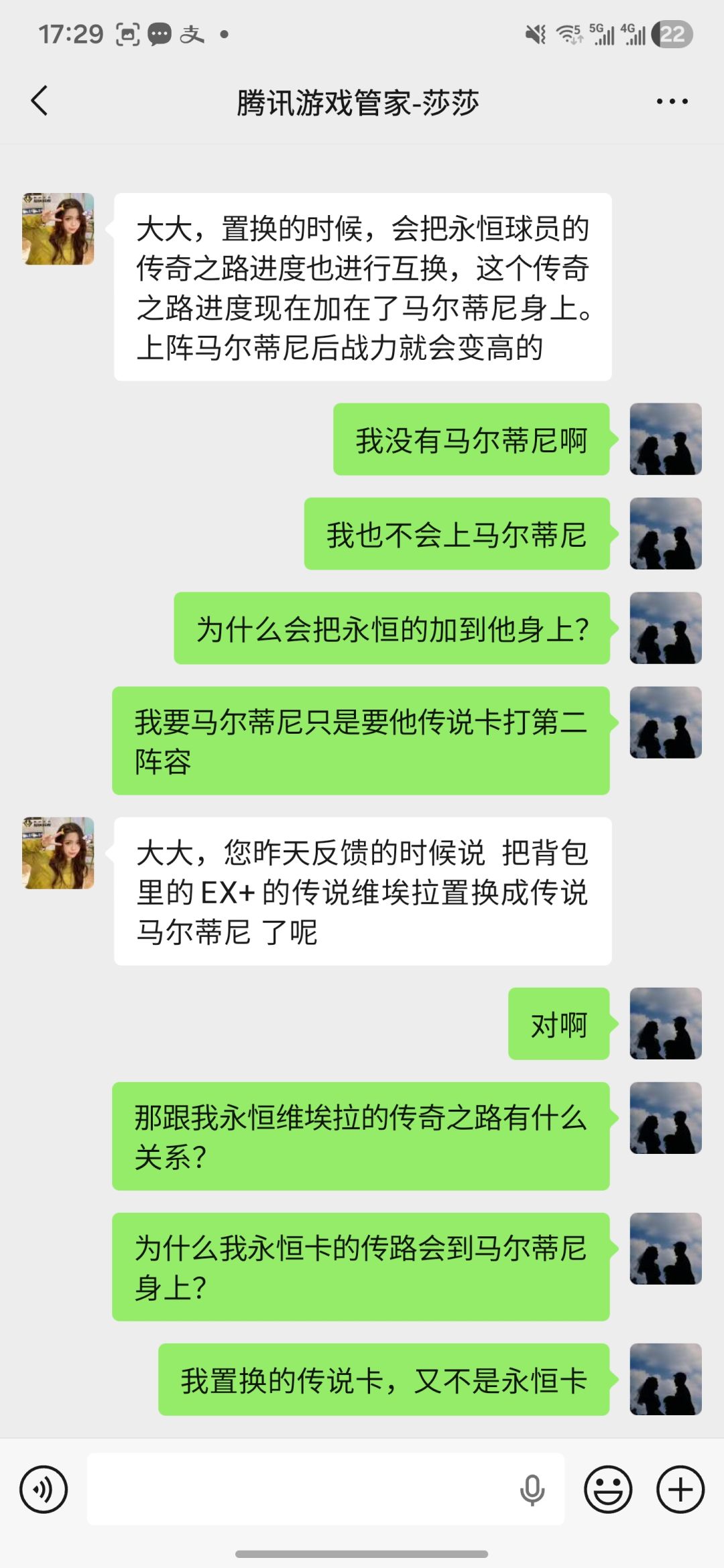 12月12号,置换活动出来后,因为我阵容里已经有ux永恒维埃拉,包里有个ex+的传说维埃拉,反正放那也是浪费,我就把包里没用的ex+传说维埃拉给置换成马尔蒂尼了,结果置换完后就发现战力掉了很多,找了半天发现是维埃拉的传路没了,我就第一时间去找了客服莎莎,莎莎说给工作人员反馈问题让我先等,我想着可能也是第一次遇到这种问题,我就等等。结果今天客服过来给我说的驴唇不对马嘴,连永恒和传说卡都分不清楚,这样就能当游戏的客服了?然后我就给他解释了一遍,告诉我再等1-3个工作日。我就想问了,你们天天是有多大的工作量啊,游戏里各种bug,出卡纯靠复制粘贴,缝合怪,就算这样还有我们这群玩家一直在坚持着玩,希望老六和各位策划能够认真地对待这个游戏,不要凉了玩家们的心。
