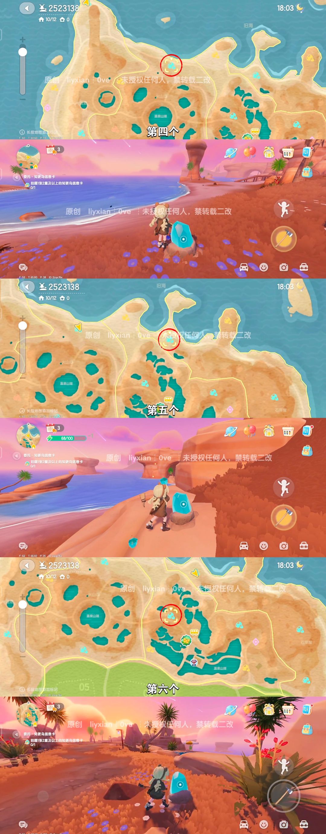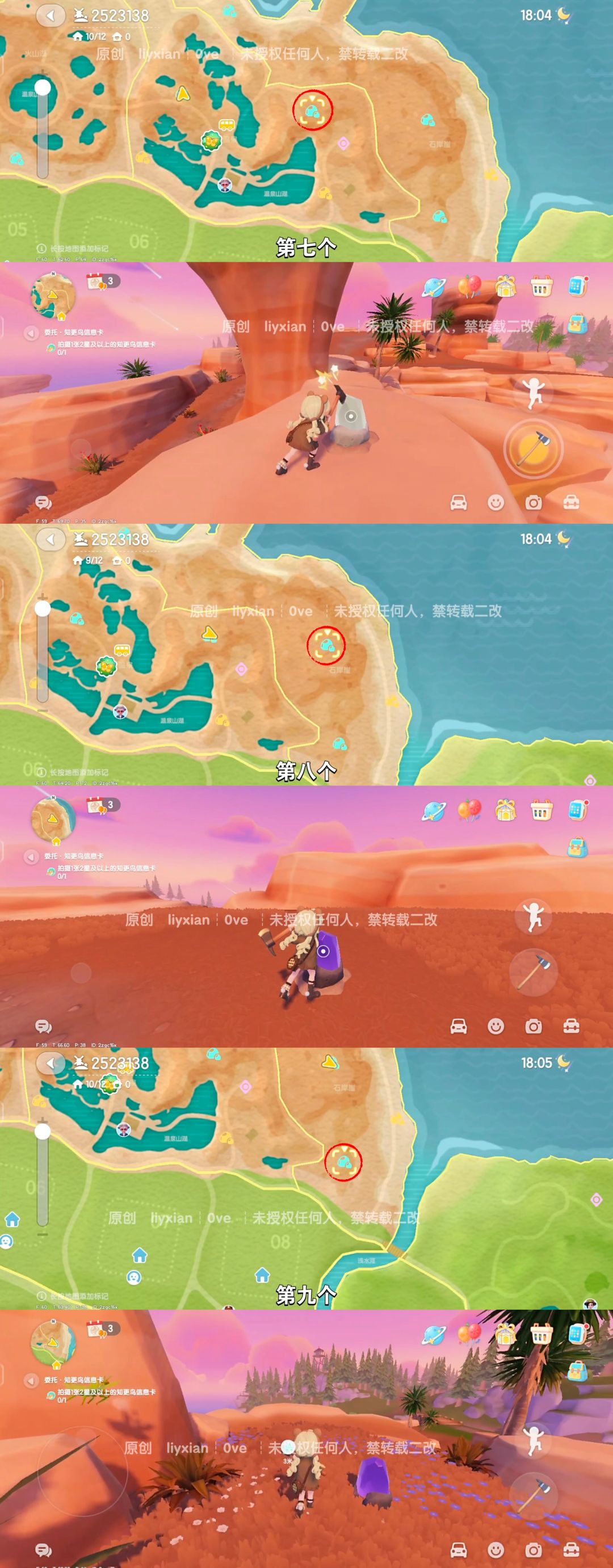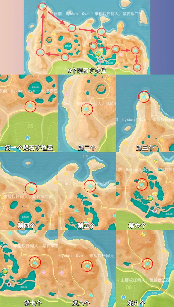 今天9个星陨碎片陨石矿 点位如图,一共有三个颜色的星陨碎片,每个颜色3个点位,共9个需要采集。