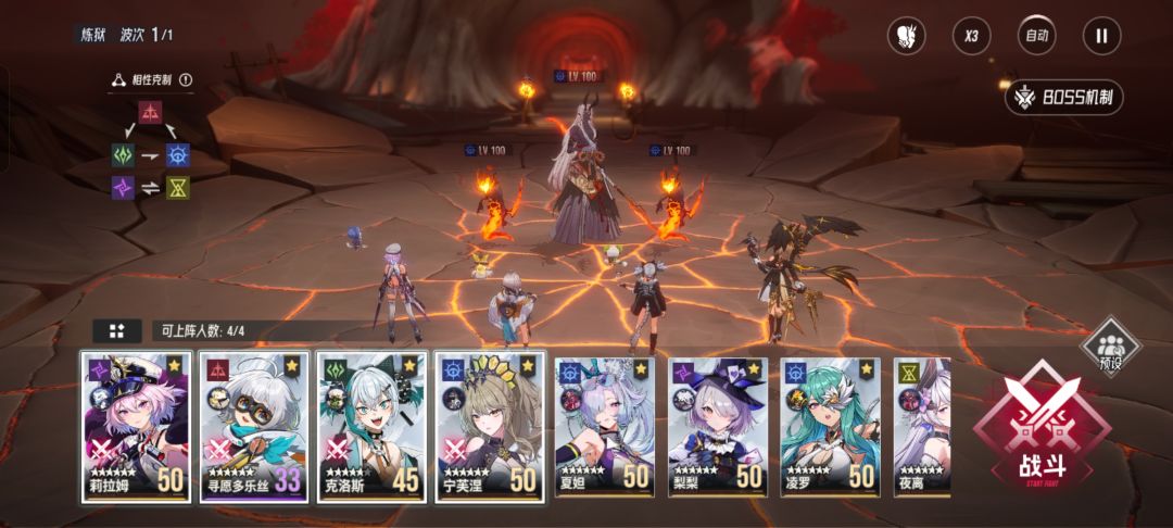 炼狱津关卡机制是,我方每有一种属性的任意个角色总计行动四次,就会给这个属性的所有角色造成一次伤害,并增加这个属性角色所受的伤害。所以上阵的属性越多,生存压力就越小,通关越稳定。四色阵容是打炼狱津的最优选择。