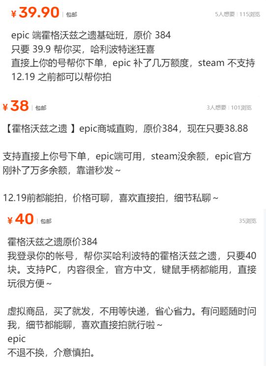 Epic免费送《霍格沃兹之遗》,但二手平台出现信息差代购乱象!