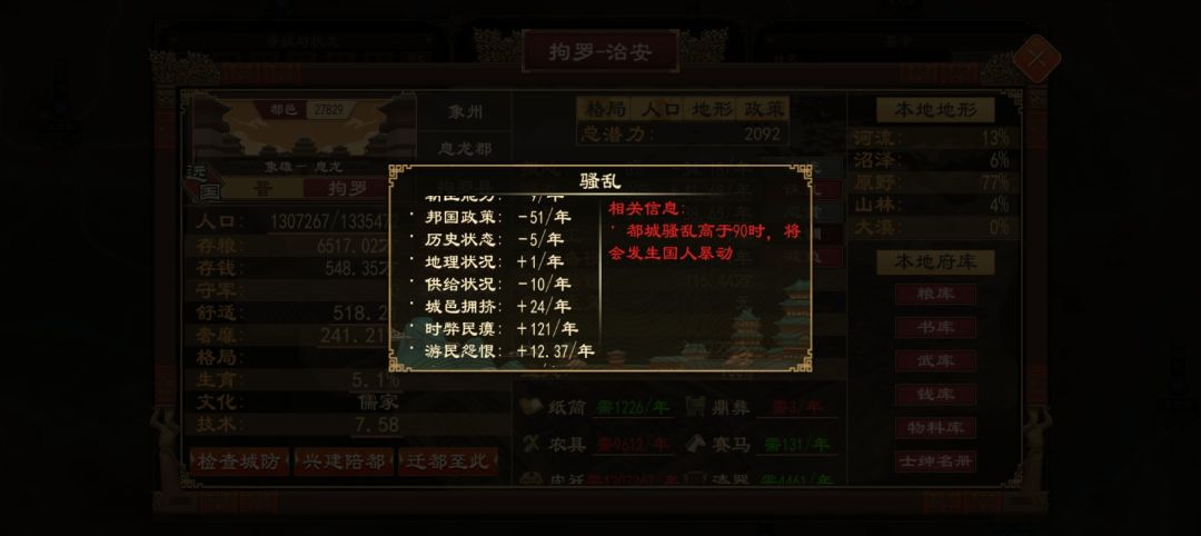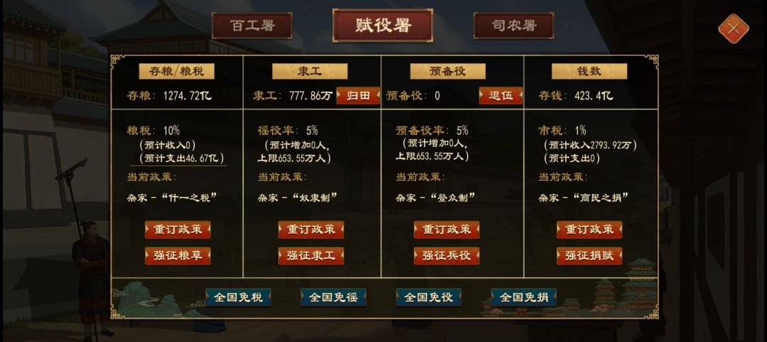 祖宗之法不可变,我是不进国族的那一类,一直留在圣人阶段,所以真的不能不废政策进国族?即使天下海清河晏久已,钱币也不够我财政支出的一个零头。民需玩过后,发现即使全国这么多人口的需求总和,换算钱币也没有多少亿。估算顶天了三四十亿,而且布衣要造几千个厂,铜矿茶叶会枯竭,铁矿要吃技术buff,其它资源需求我全满足了才一年十几个亿。换算我财政三四十亿乘十二(俸响改革后的支出),不足零头,还不如存够总钱,迁都中心强征,十年能转运钱币到首都。还有就是有用的说一下,你们如果要做大蛋糕攒总钱,然后去俸响改革,最快办法刷市肆到地区粮产的地方,根据粮产产生市肆初始资金。我刷市肆到年产两亿粮城邑,初始资金有三四十亿钱币,有的市肆还有商路(有商路的市肆会有ai商队买粮,一般一年一次,一次一两个亿钱币)。缺点是要发育起来的城邑才有高粮产,就要去点政策,而且地图大很多垃圾城,刷起来废时间。市肆每个地区都有了,地图小的可以卖粮加速破产重新刷,全图都有的话去买粮一次要转运十年,来回都二十年了。第二种办法:持之以恒吃零售,我这里存档情况就是,扩张商路百城有两千钱。股份有五十一股可以扩张,有钱的城邑有些会自动扩展,高股价市肆有三次扩展机会,一次扩张要一千贤能,扩展商路会失败,又累又少钱,但每年给市肆源源不断赚钱,不是零售给你转钱。小心市肆每年卖粮导致市肆没有资金就会破产。