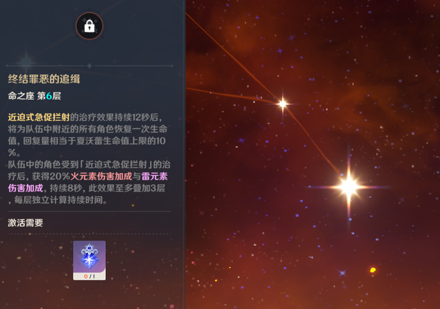 解锁了6命之后,基于元素战技的治疗效果,受到治疗的队友,还能获得夏沃蕾20%的雷、火元素伤害加成,持续8s,可叠加3层。