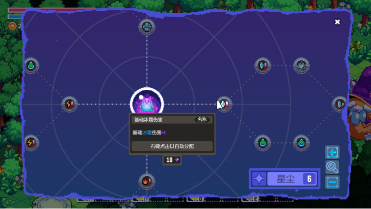 此外还有局外构筑,每一次探索,我们可以获得星尘,而在星辰中可以进行能力值的加点。例如可以消耗十点星辰对基础属性伤害进行提升,本作有肉鸽游戏越玩越强的成分在里面,很多时候不小心死一次会发现游戏变得简单了,但在下一个难关中,又会发现有一点棘手,但随着时间的增长,自己的游戏理解和技术变强,会发现,我靠,真好玩!这就是肉鸽游戏的魅力~
