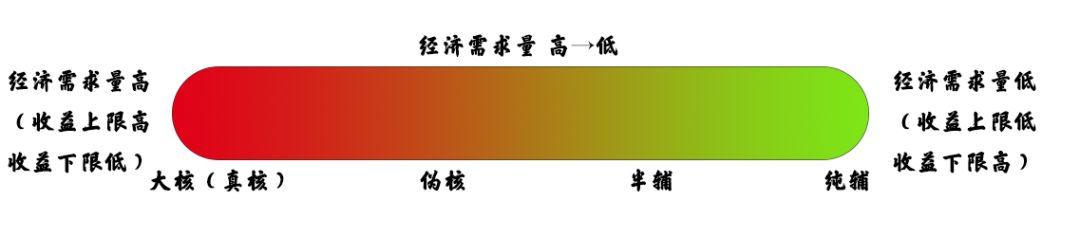 一般来说,收益上限高的英雄相对比较吃经济,收益下限高的英雄相对不需要吃经济。其中,大多数伪核是对于经济需求量高,但是实际收益上限远低于大核的。