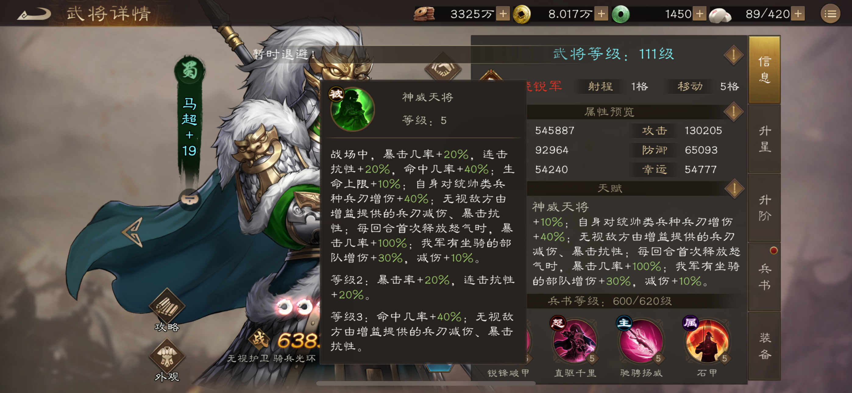但是,马超对于资源有大量的需求,低配置的马超打打PVE打桩可以,高难度本不行,PVP更是上不了场的,秒不了人就是被人秒。