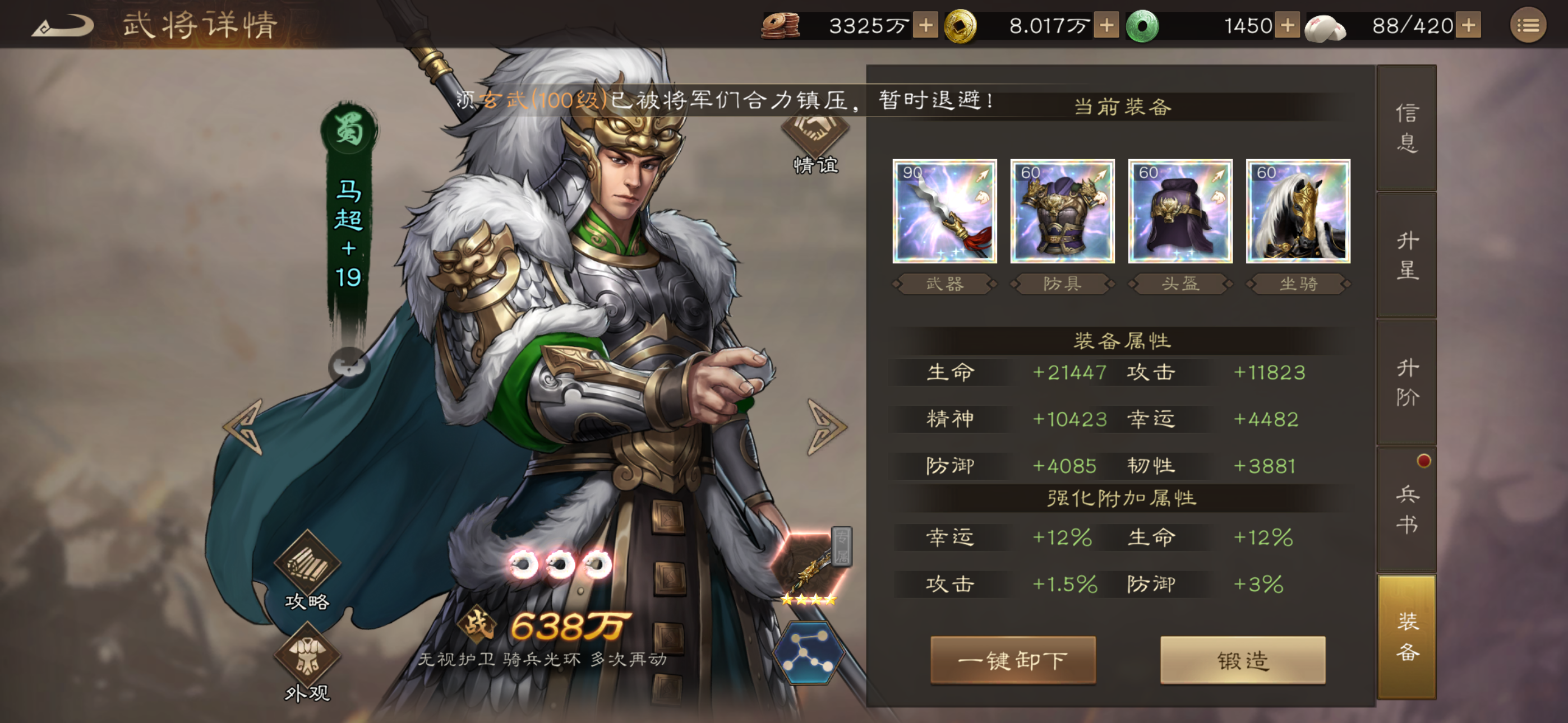 这次马超无双活动,抽了300抽拿了8个本体,马超13星,神兵也屯着先不准备换,经过这两天,官方已经把马超加强了很多,拉满的强度已经可以成为首发了(前提是拉满)。那对于平民来讲,马超推荐抽么?和之前无双比起来怎么样