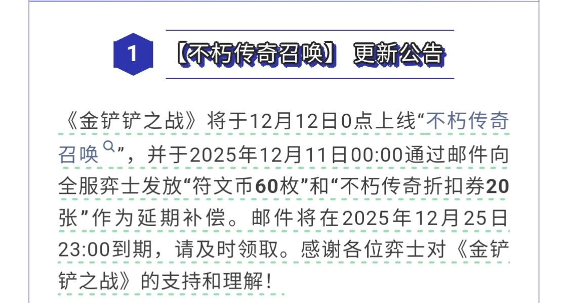 首先事件的起因就在于金铲铲2025年12月12日0点上线的活动“不朽传奇召唤”,在这个召唤活动中有个很神奇的设定,每十次召唤送一次符文宝箱召唤,而这次符文宝箱召唤获得的小小英雄必定是你未拥有的小小英雄。