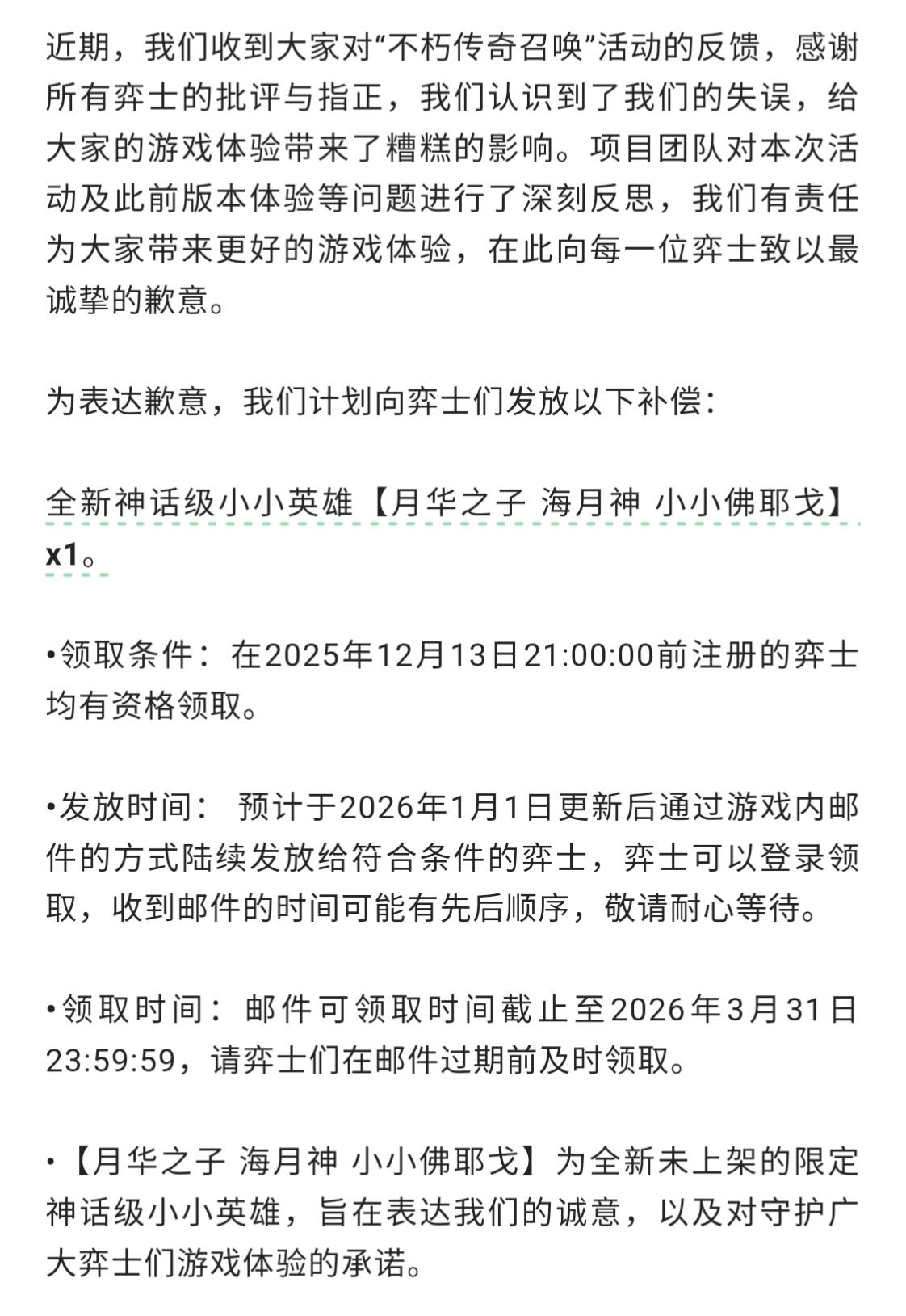 甚至他还要给活动下架前参与活动的玩家补偿一个英雄级小小英雄,虽然也不是什么好东西,但细想之下令人发笑,普通玩家一觉睡醒,之前作为延期补偿的符文币和折扣券没了作用不说,补偿小小英雄居然也和自己无关。
