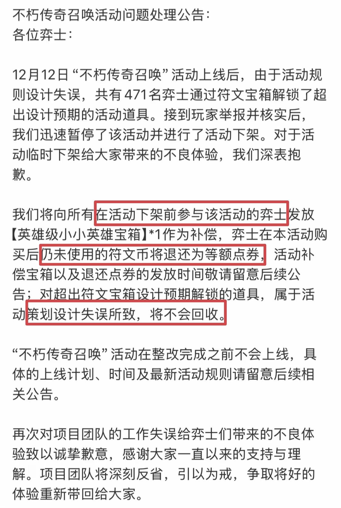官方在发现这个情况后也是紧急下架了活动,就在大家猜测官方是会回档还是会有什么措施时,官方表态说不会回档,并且会把购买的符文币退换成等额点券。