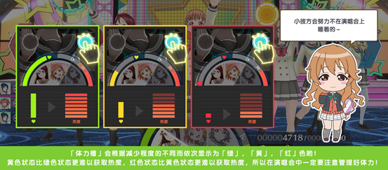【体力槽】降低后【热度】获取也会相应降低,降低到0后演唱会就失败啦,并且无法获得奖励物品!而保持体力需要使用到相关角色特技进行体力回复,或者完成演唱会中的【表现机会】避免体力大幅减少。