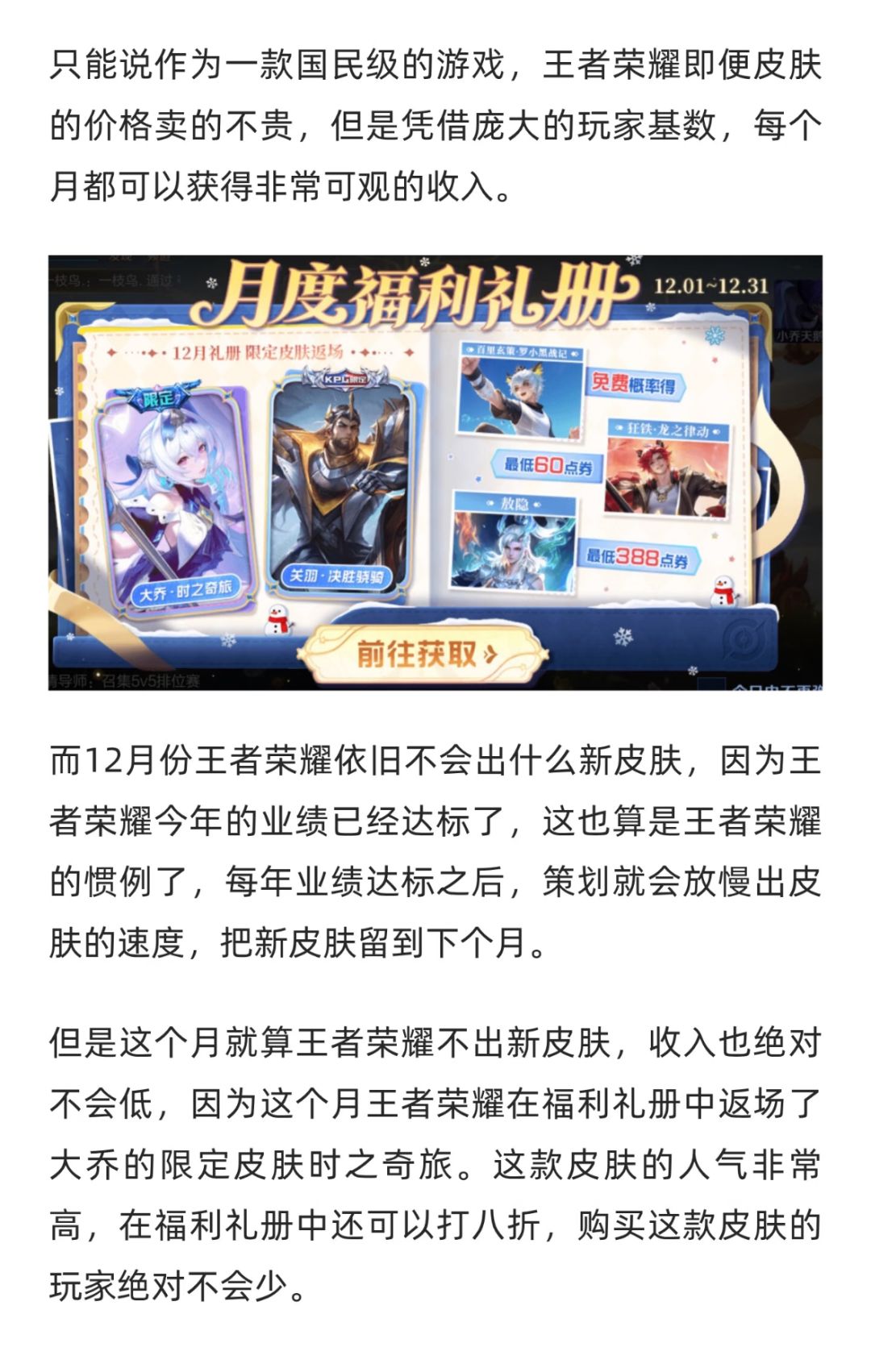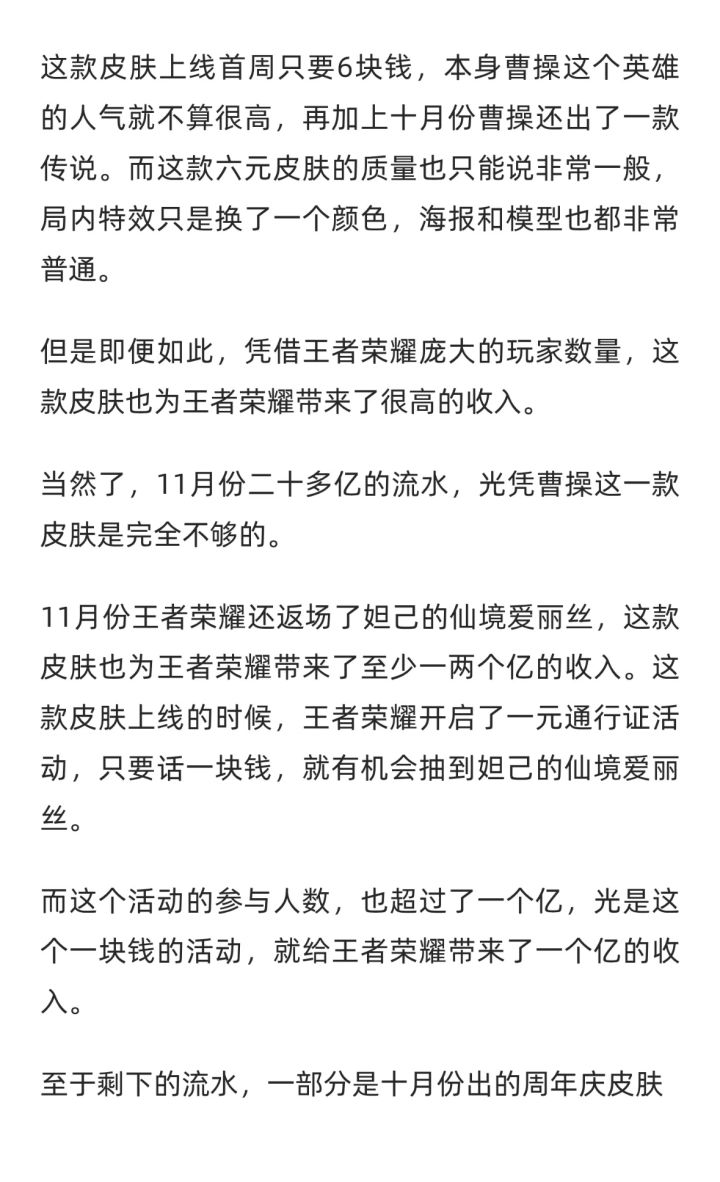 真正的吸金密码藏在完善的商业生态中:妲己「仙境爱丽丝」等热门限定返场通过1元通行证活动吸引超1亿玩家参与,收入破亿;貂蝉「仲夏夜之梦」等老牌皮肤持续热销,进阶战令与贵族特权构成的“基础收入盘”贡献了80%流水。