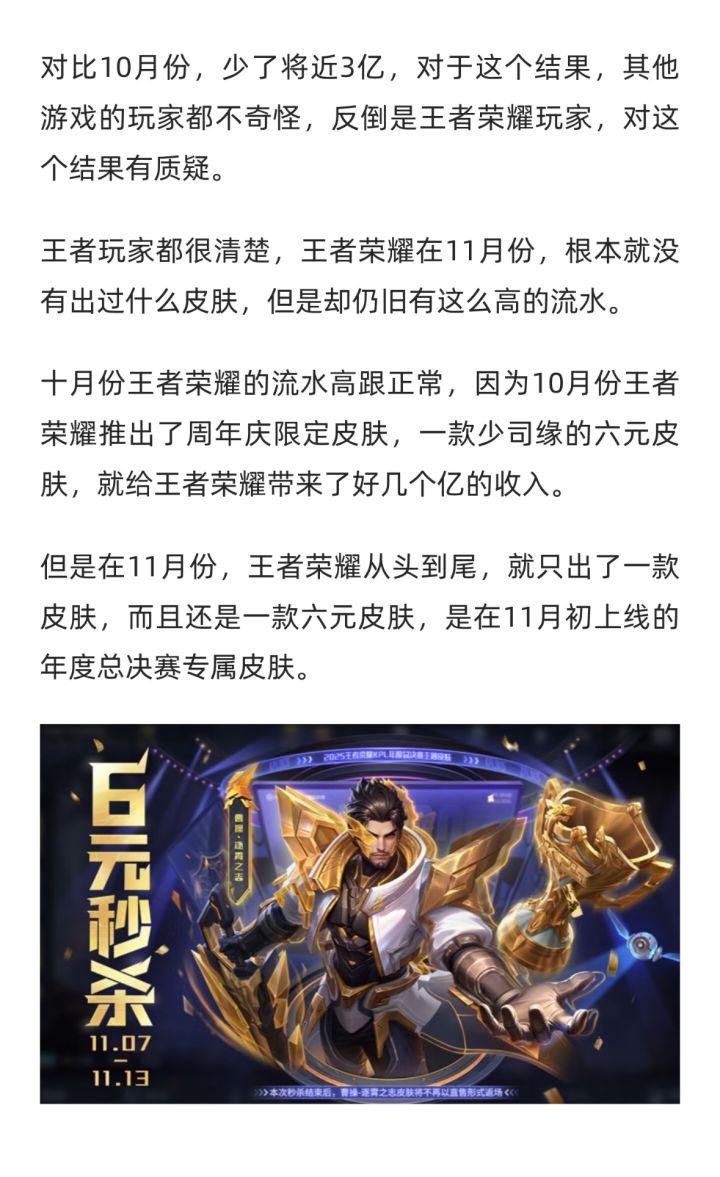 2025年11月手游流水榜重磅出炉,王者荣耀以28亿+的成绩稳坐榜首,用实力诠释“国民级游戏”的统治力。令人惊叹的是,本月官方仅上架一款新皮肤——曹操KPL总决赛限定「逐霄之志」,6元秒杀价、勇者品质的设定,看似“轻量化”却创下数百万销量。