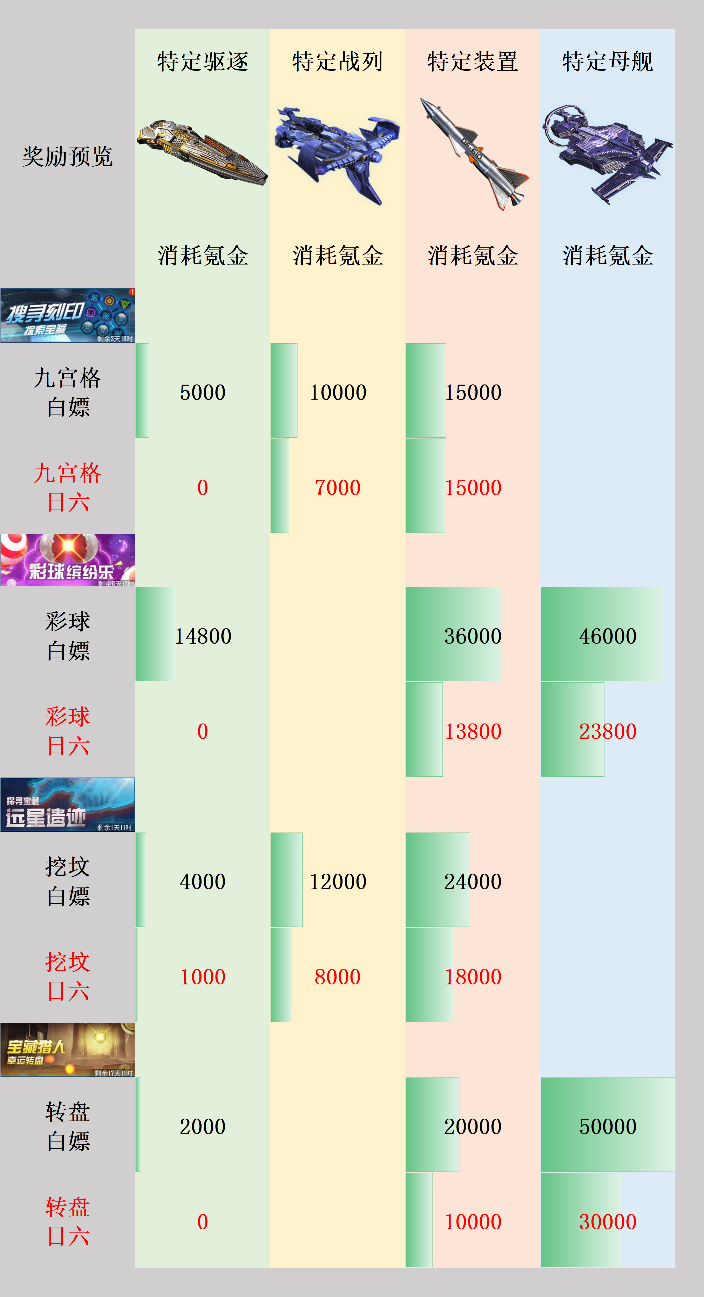 活动通常来看,奖励会分为限定装置,限定战舰,我们就是要利用最低的成本来获取最高的收益。