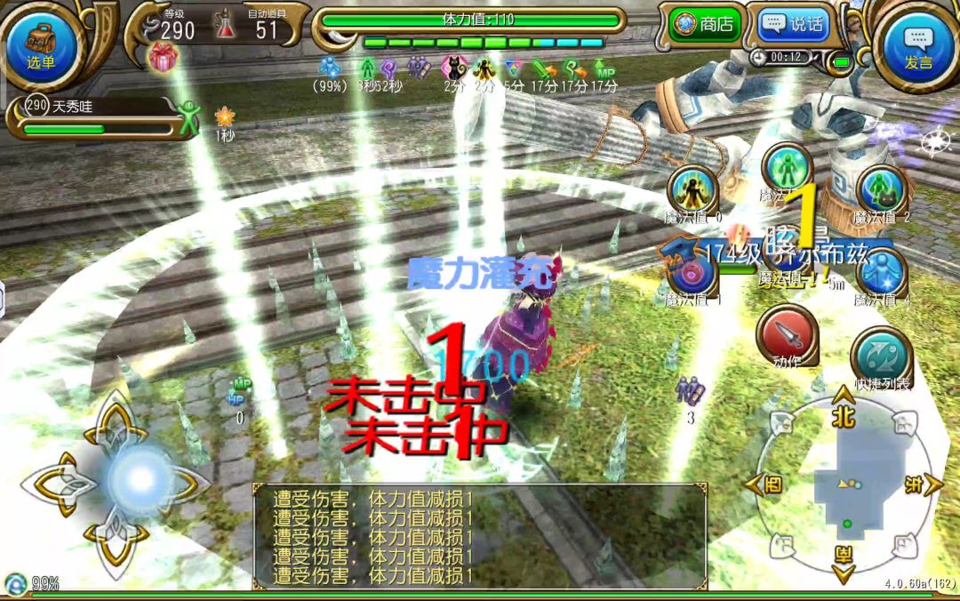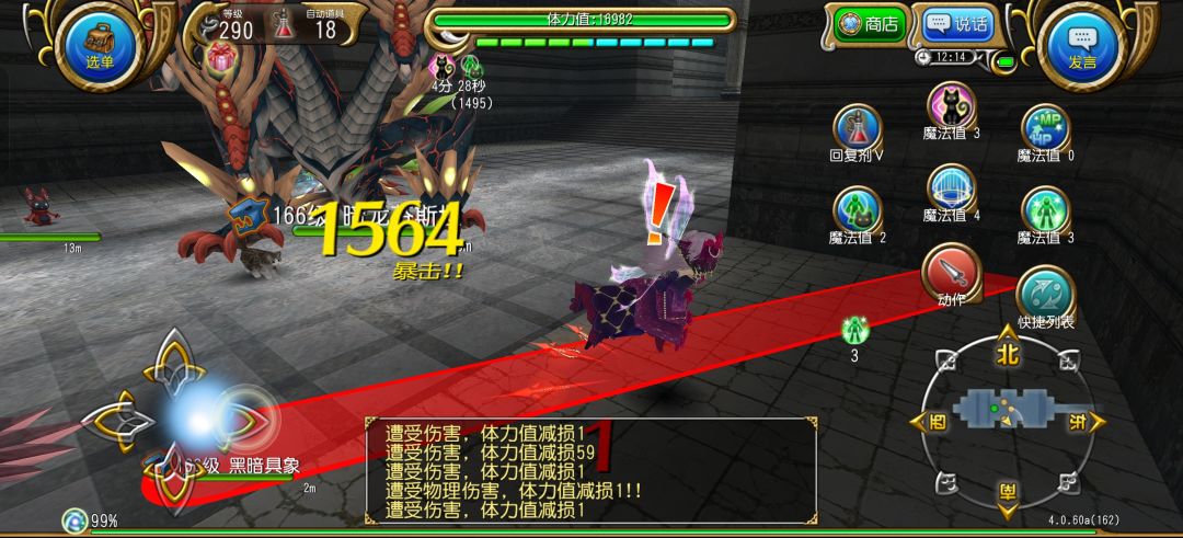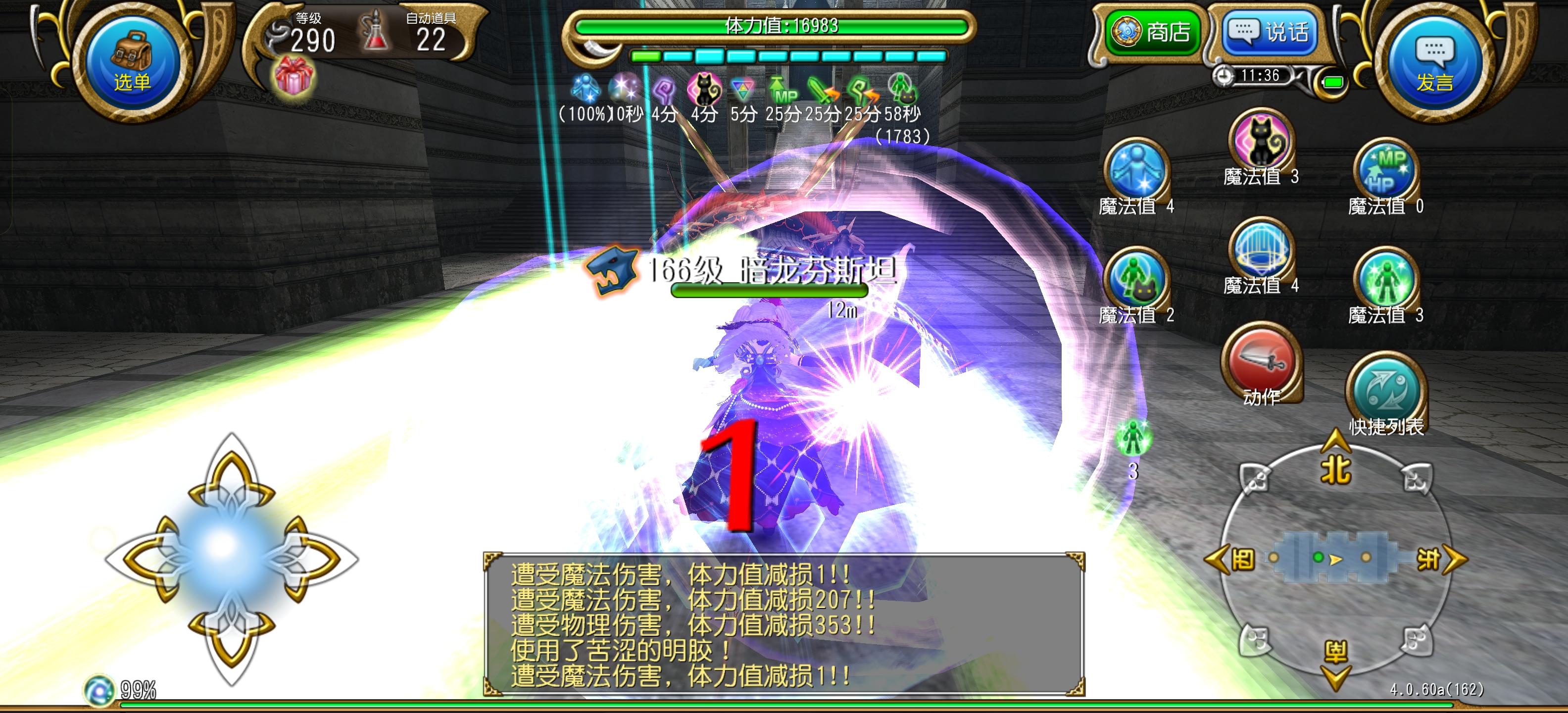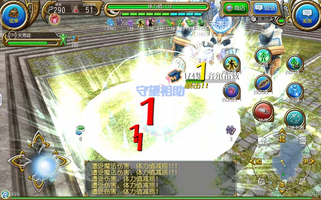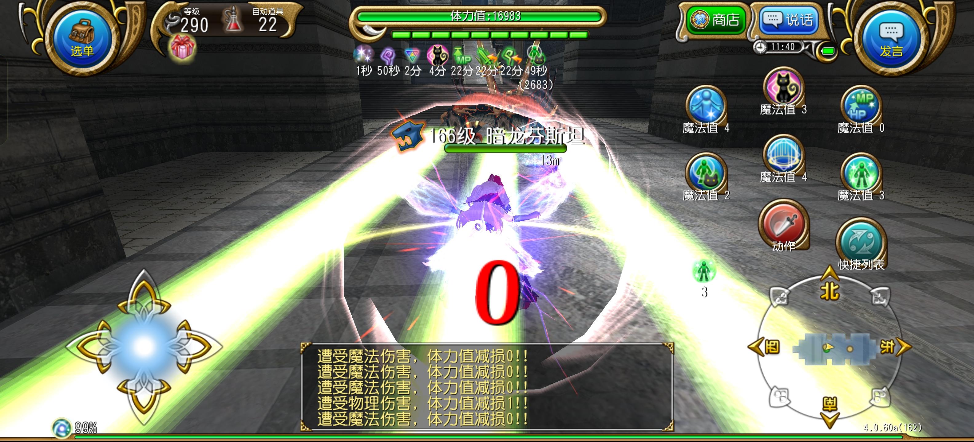 可这就显得很迷惑,那石肤假血到底吃不吃结界减伤?这里以暗龙魔法伤害的柱形激光为例,我们来看看不开结界的石肤掉血和站在结界中的石肤掉血有何区别: