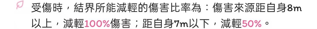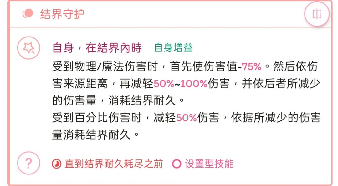 2、结界的耐久值只在切图、重连游戏时刷新,在同一张地图中时,重新召出结界是不会刷新耐久的,耐久值和上一个结界的剩余耐久相同。另外耐久完全耗尽后,结界会直接消失,下一次新召出来的结界只保留最低的1点耐久值,当然结界的各种效果包括减伤还是照常生效的,也不存在1耐久结界的效果减半之类的机制。