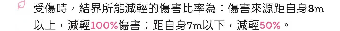 1、角色站在结界中受到伤害时会吃到结界提供的减伤,包括角色套在身上的假血,石肤假血、教导假血也能吃到结界减伤。与此同时,角色最终受到多少点伤害,结界也会一起跟着掉相同数值的耐久。