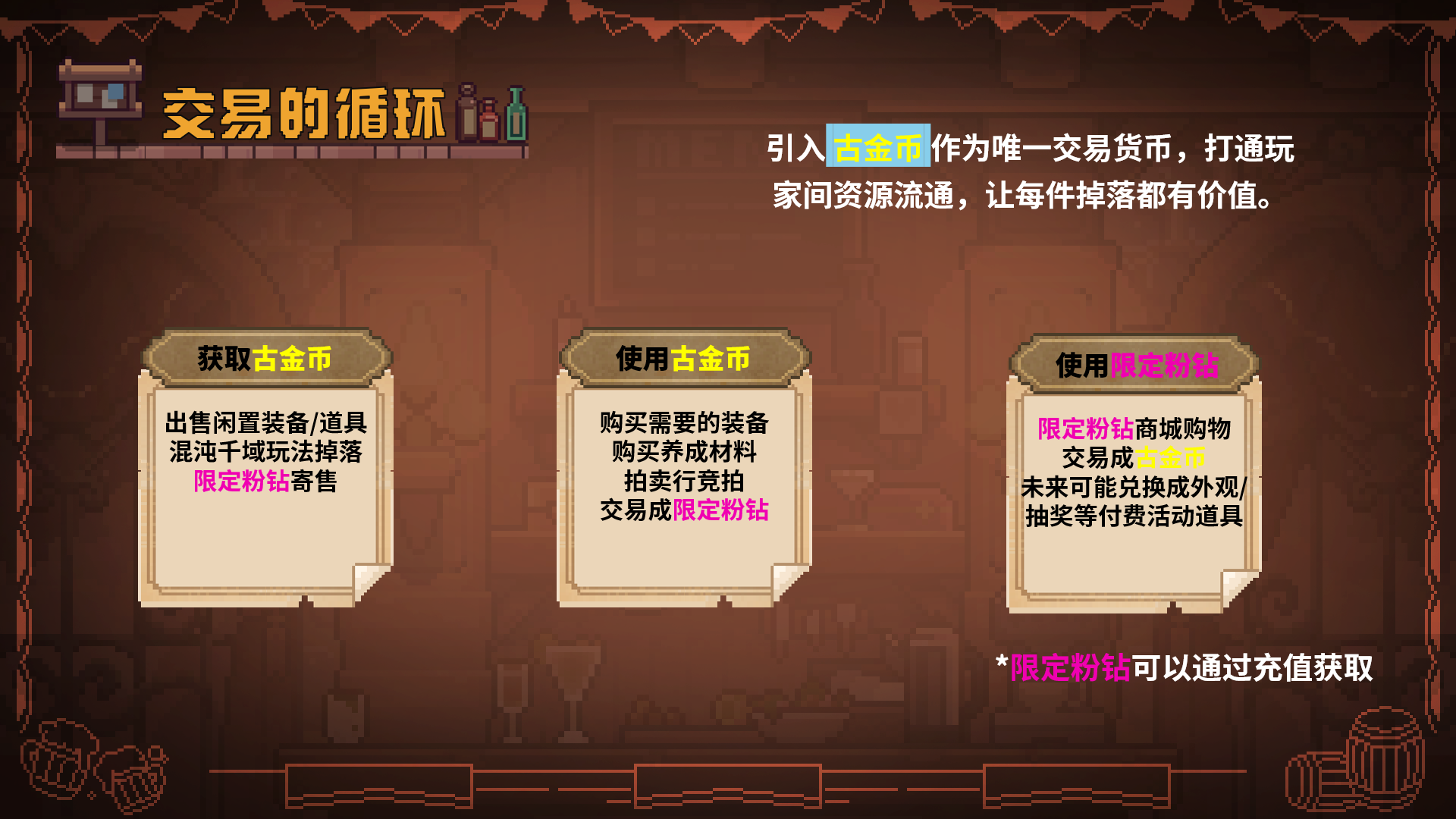 反过来也是一样的,混沌千域本身也会产出古金币,勇者们可以直接把混沌千域刷到的材料去交易系统换古金币,消耗古金币去购买其他勇者卖出的资源,用来提升自己,或者来拍卖行,竞拍商品;或者换成限定粉钻,用限定粉钻购买商品提升自己,提升自己了也可以更好刷混沌千域