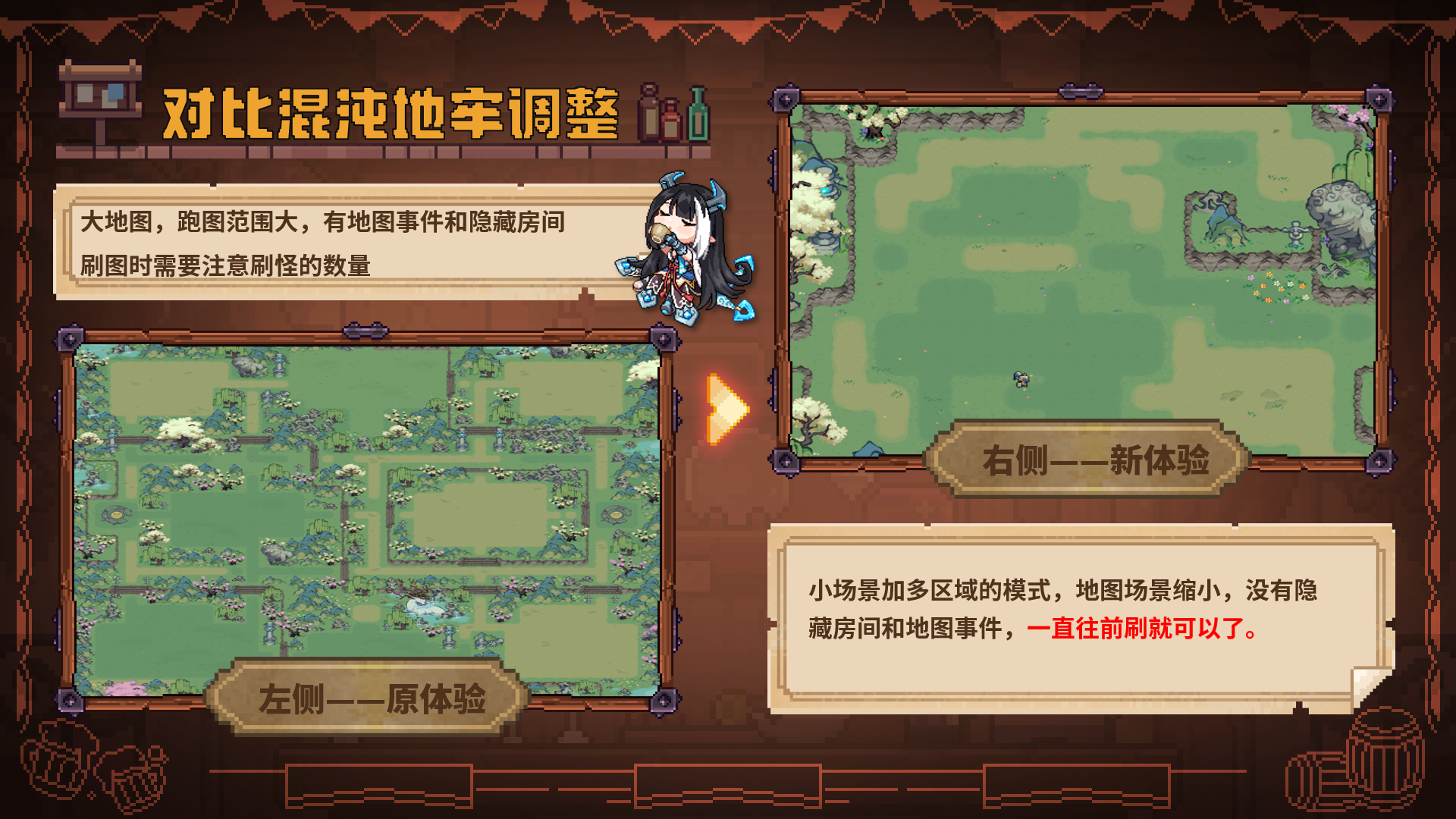地图优化:删除隐藏区域和怪物数量机制,小场景与多区域组合构成的模式,地图缩小,同时每次挑战关卡都会随机刷出0-4 个事件 + 0-2 个机遇。不同的事件对应不同的掉落产出,机遇也会产出一部分的材料。