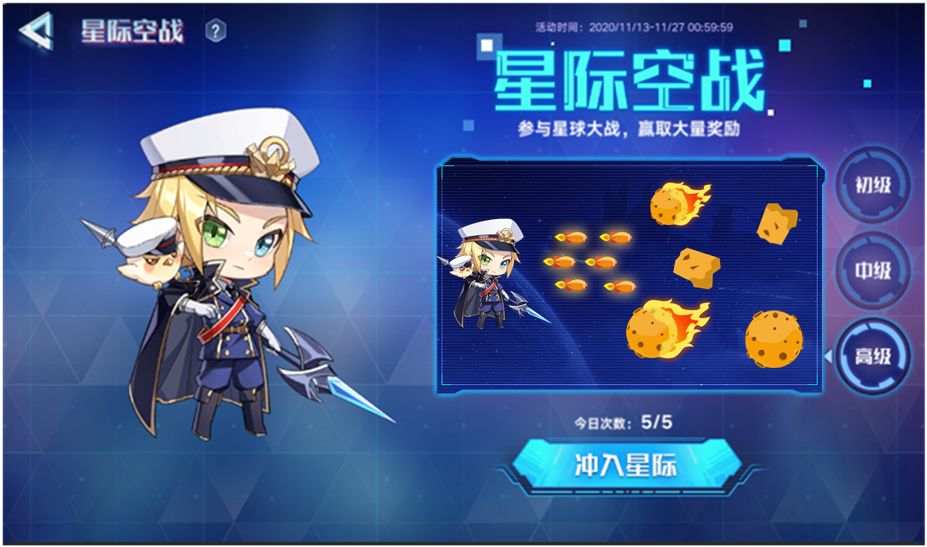 活动内容:在星际空战中操控星际舰长,升级自身能力击毁不断出现的陨石获取积分!游戏每日限定次数,每次游戏结束后累计分数,分数达一定值之后即可领取对应阶段奖励。