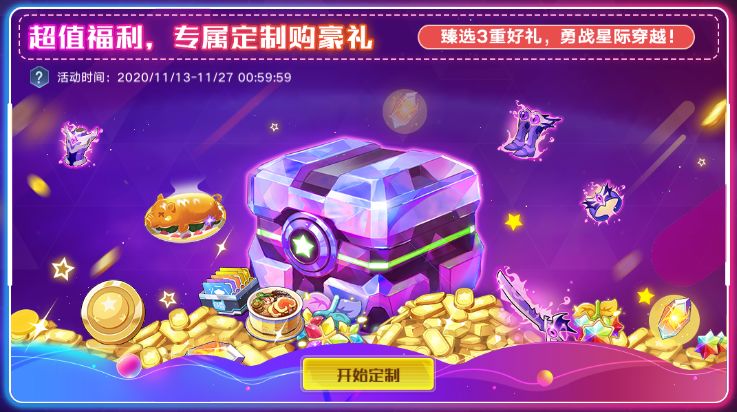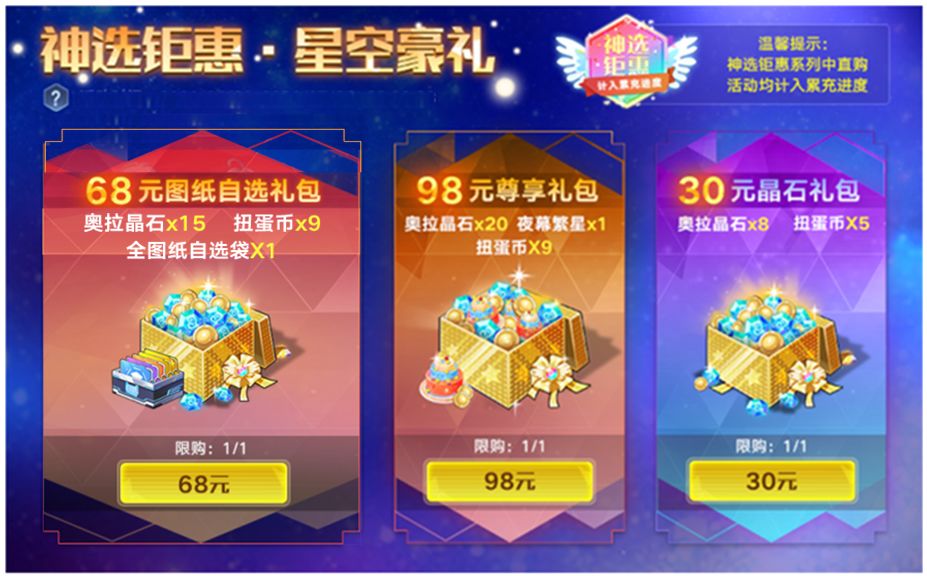 活动内容:星空豪礼上新!新增全图纸自选礼包限时购,礼包内容包括入手要趁早哦~(购买全图纸自选礼包算入累充进度)