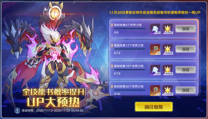 活动内容:为期一周的全技能书祈愿Up预热活动开启~活动期间积极参与各种玩法收集世界之钥道具,即可累计进度,完成收集任务即可领取对应福利奖励!(温馨提示:全技能书祈愿限时一周UP将在11月20日更新后开启)